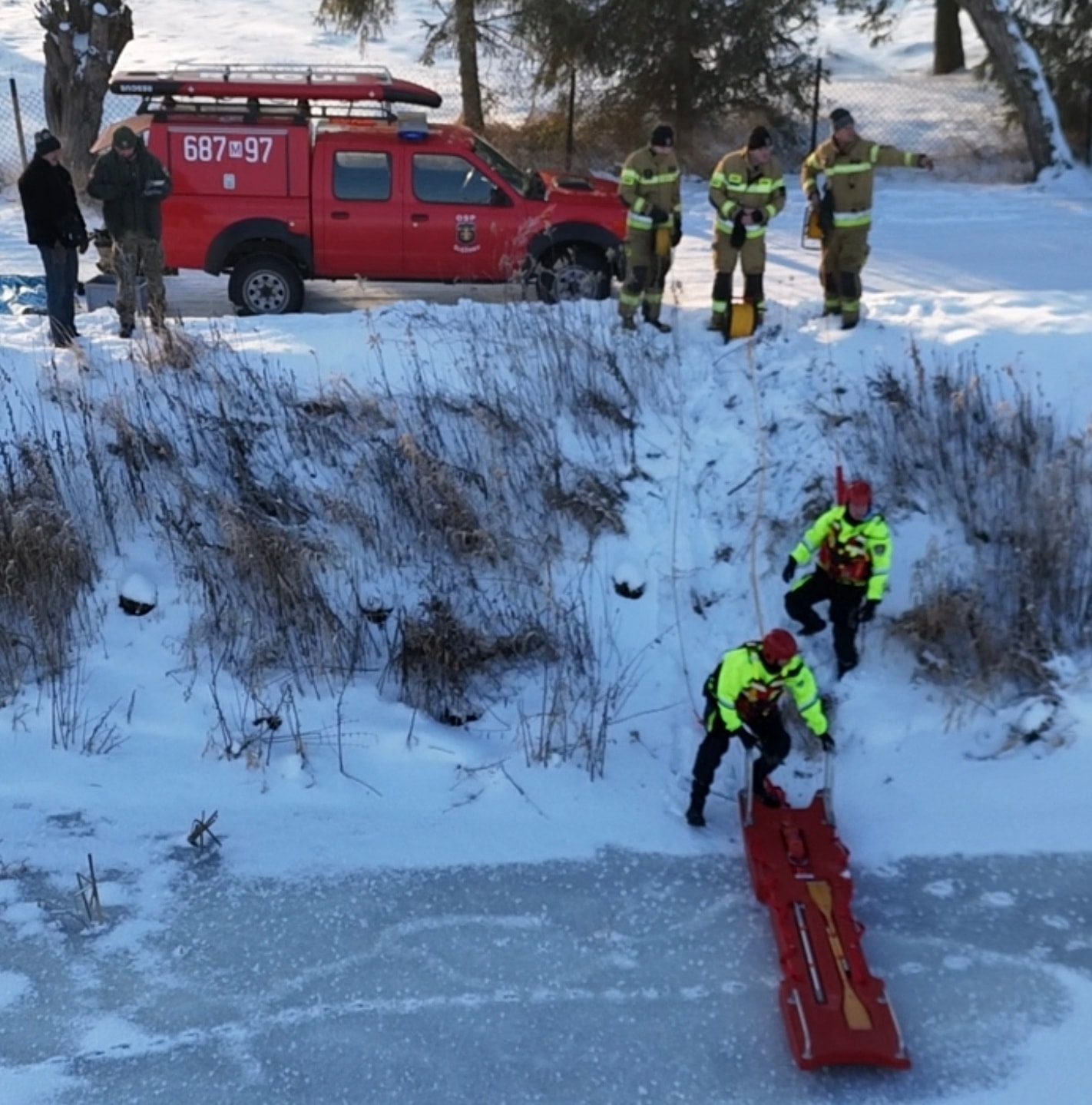 Z uwagi na skrajnie trudne warunki oraz konieczność zachowania maksymalnego bezpieczeństwa, strażacy zdecydowali się na użycie specjalistycznych sani lodowych, które umożliwiły bezpieczne dotarcie do uwięzionego ptaka. Każdy ruch był precyzyjnie zaplanowany – jeden błąd mógł zakończyć się wpadnięciem do lodowatej wody.