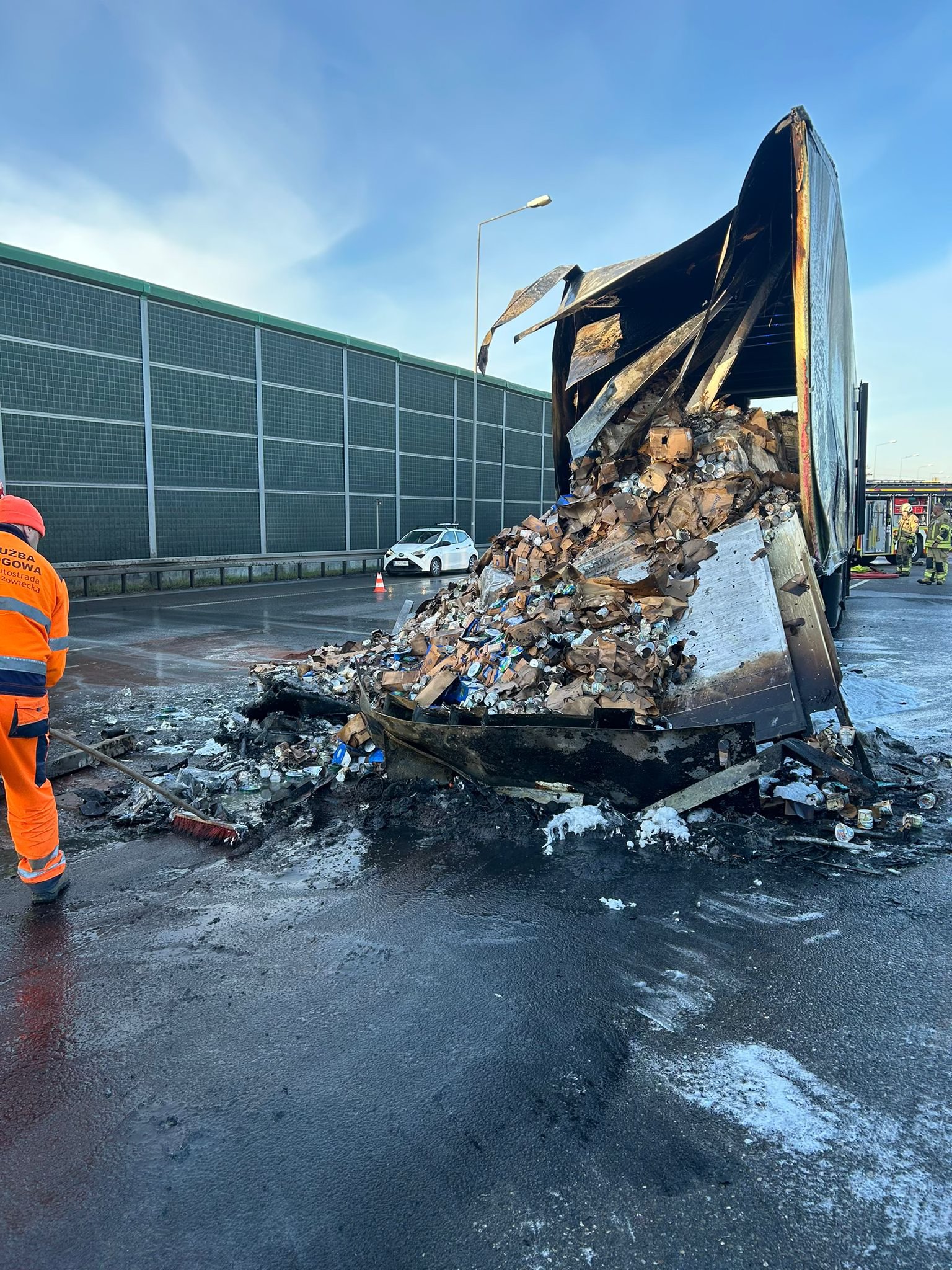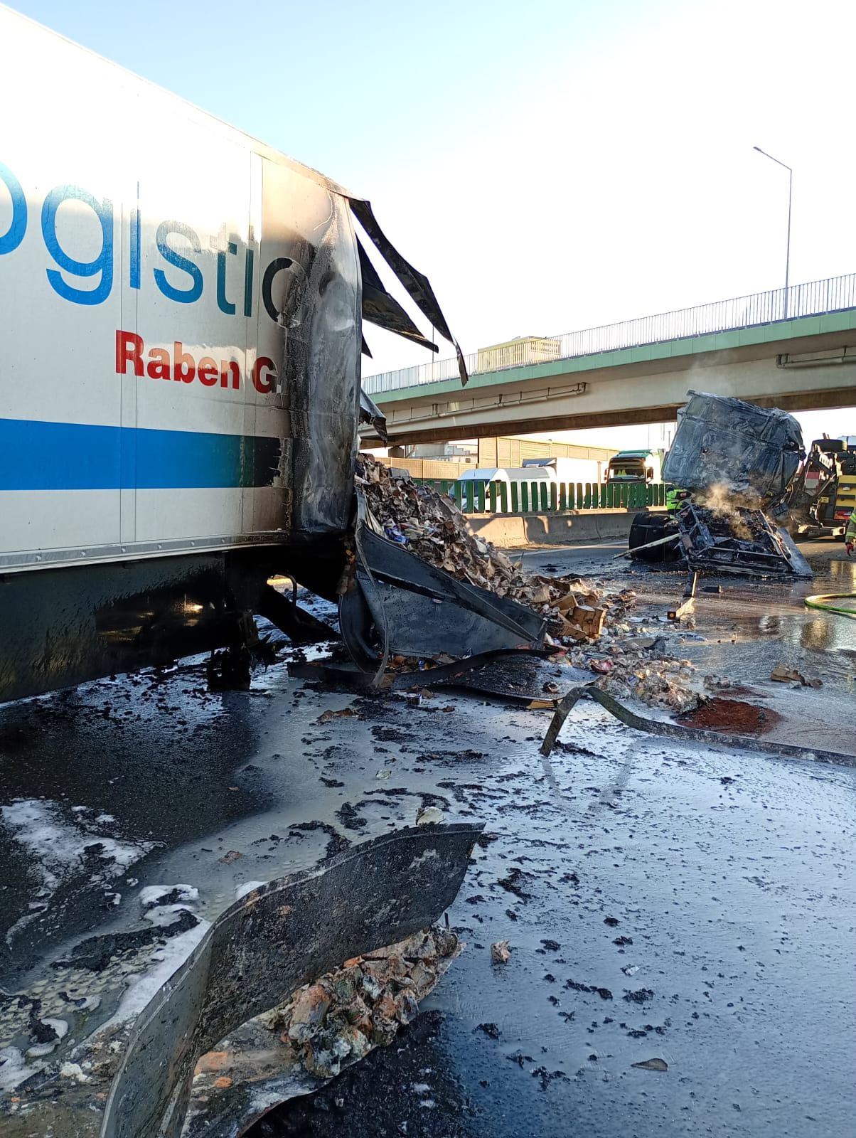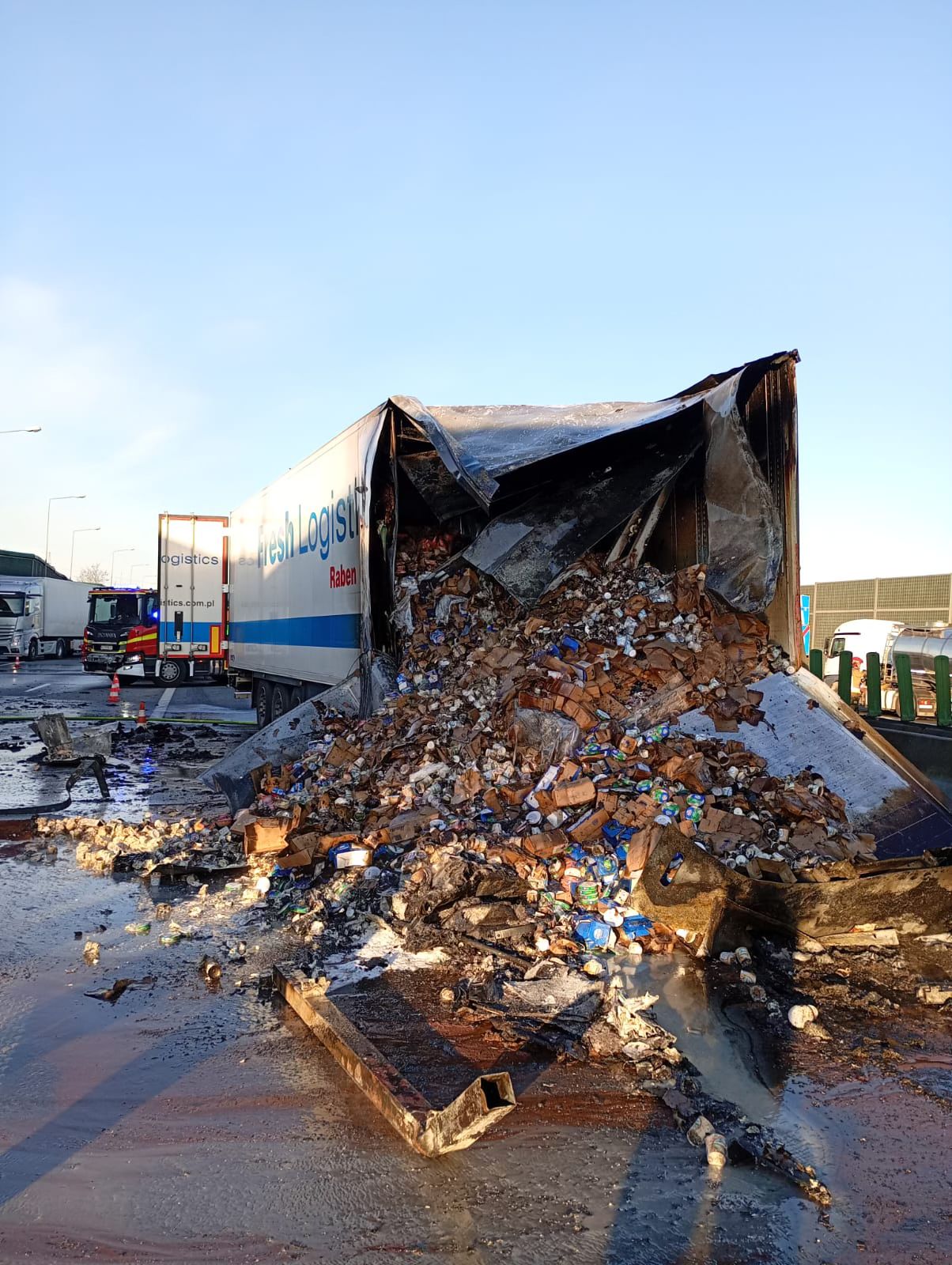 Dramatyczny zwrot akcji nastąpił kilka godzin później. Około godziny 6:20, w trakcie prac porządkowych, jeden z uszkodzonych samochodów ciężarowych nagle stanął w ogniu. Ogień bardzo szybko objął kabinę pojazdu oraz jego konstrukcję, a płomienie były widoczne z dużej odległości. Na zdjęciu z miejsca zdarzenia widać doszczętnie zniszczoną kabinę ciężarówki oraz rozrzucony ładunek, który wysypał się na jezdnię. Strażacy w pełnym zabezpieczeniu prowadzili intensywne działania gaśnicze, walcząc z ogniem i jednocześnie dbając o bezpieczeństwo pozostałych uczestników ruchu.