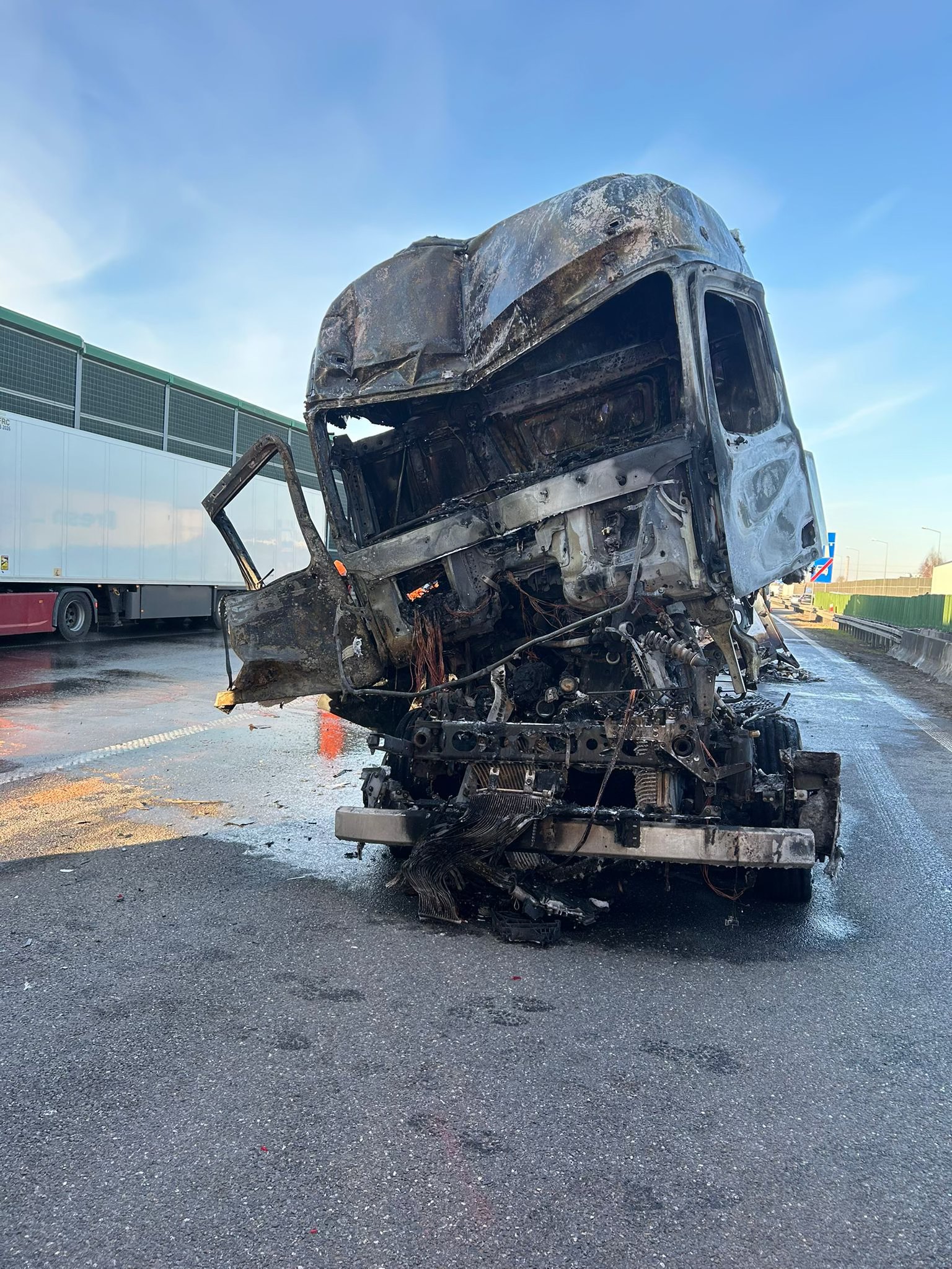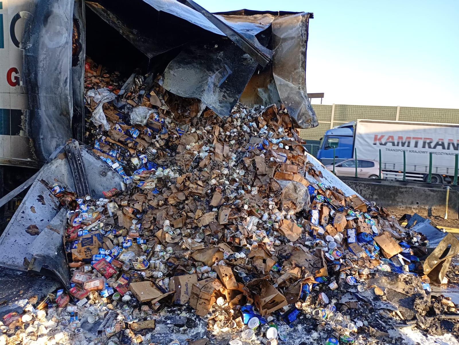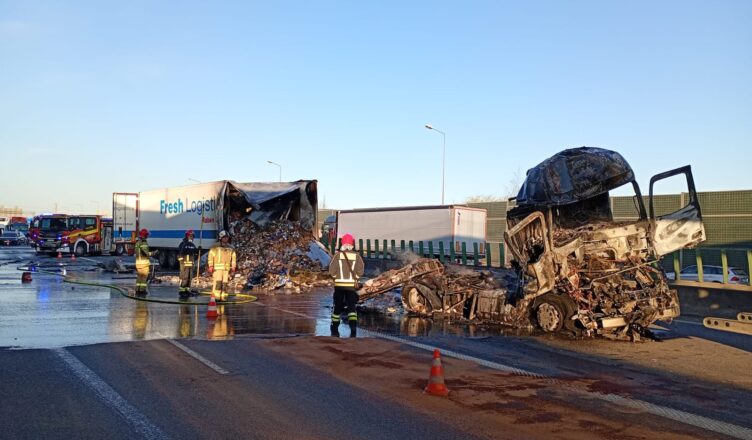 Dramatyczny zwrot akcji nastąpił kilka godzin później. Około godziny 6:20, w trakcie prac porządkowych, jeden z uszkodzonych samochodów ciężarowych nagle stanął w ogniu. Ogień bardzo szybko objął kabinę pojazdu oraz jego konstrukcję, a płomienie były widoczne z dużej odległości. Na zdjęciu z miejsca zdarzenia widać doszczętnie zniszczoną kabinę ciężarówki oraz rozrzucony ładunek, który wysypał się na jezdnię. Strażacy w pełnym zabezpieczeniu prowadzili intensywne działania gaśnicze, walcząc z ogniem i jednocześnie dbając o bezpieczeństwo pozostałych uczestników ruchu.