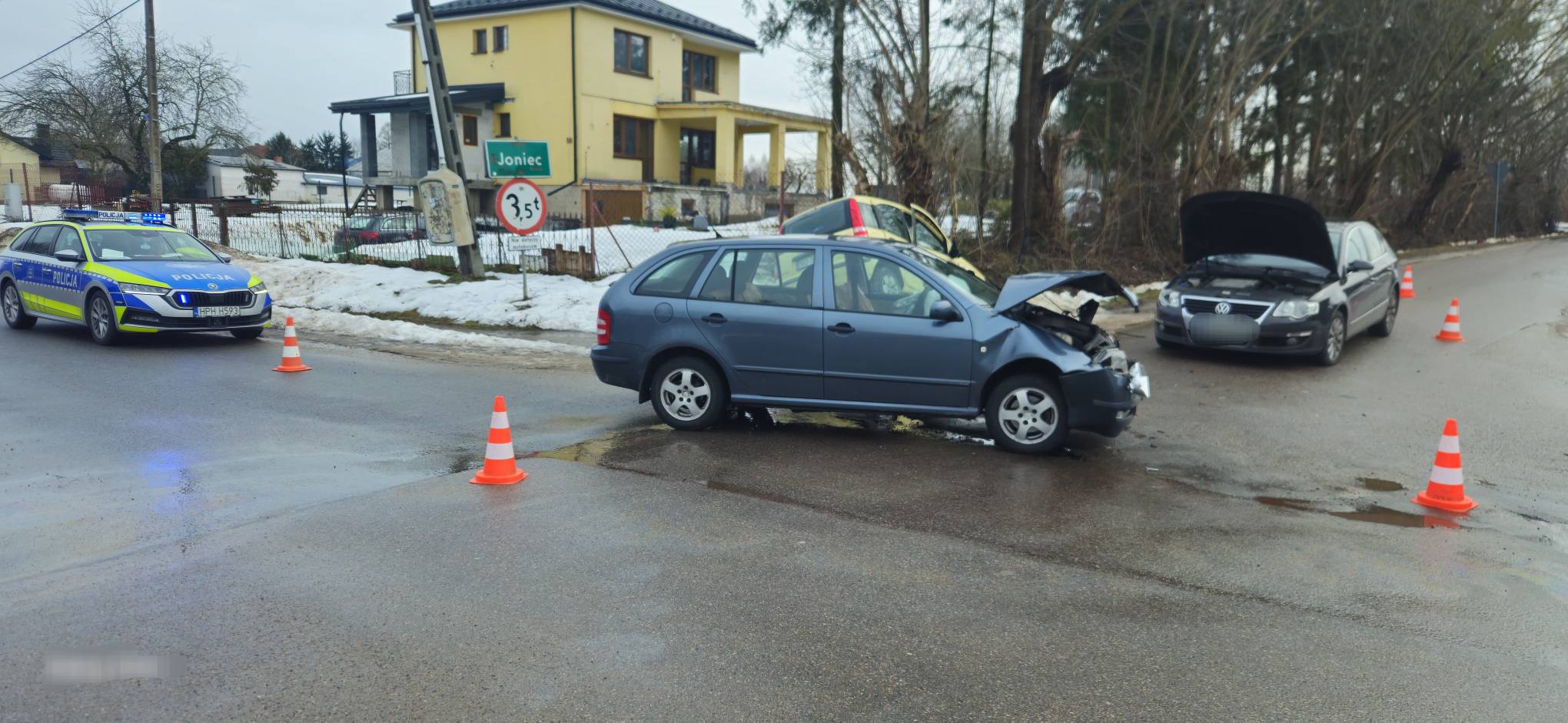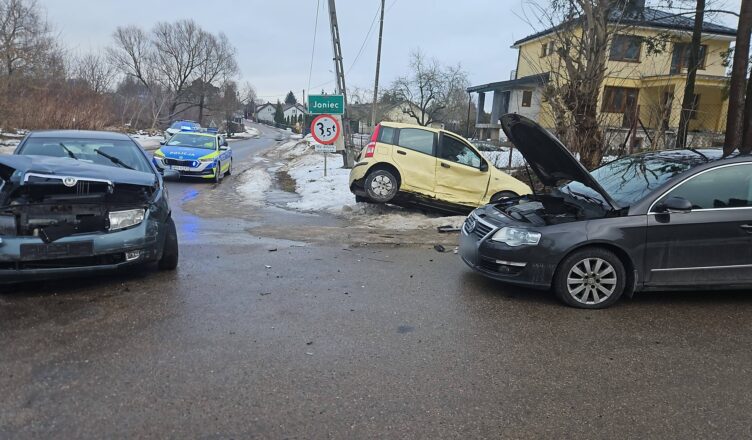 Groźnie wyglądające zderzenie trzech samochodów osobowych wstrząsnęło dziś przed południem miejscowością Joniec. Około godziny 11.40 na lokalnym skrzyżowaniu doszło do łańcuchowej kolizji, której skutki widać było z daleka – rozbite przody aut, otwarte maski, rozrzucone elementy karoserii i jeden z pojazdów wbity w przydrożny rów.
