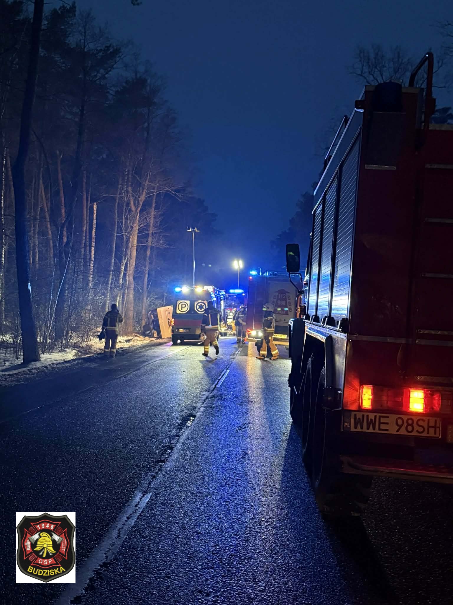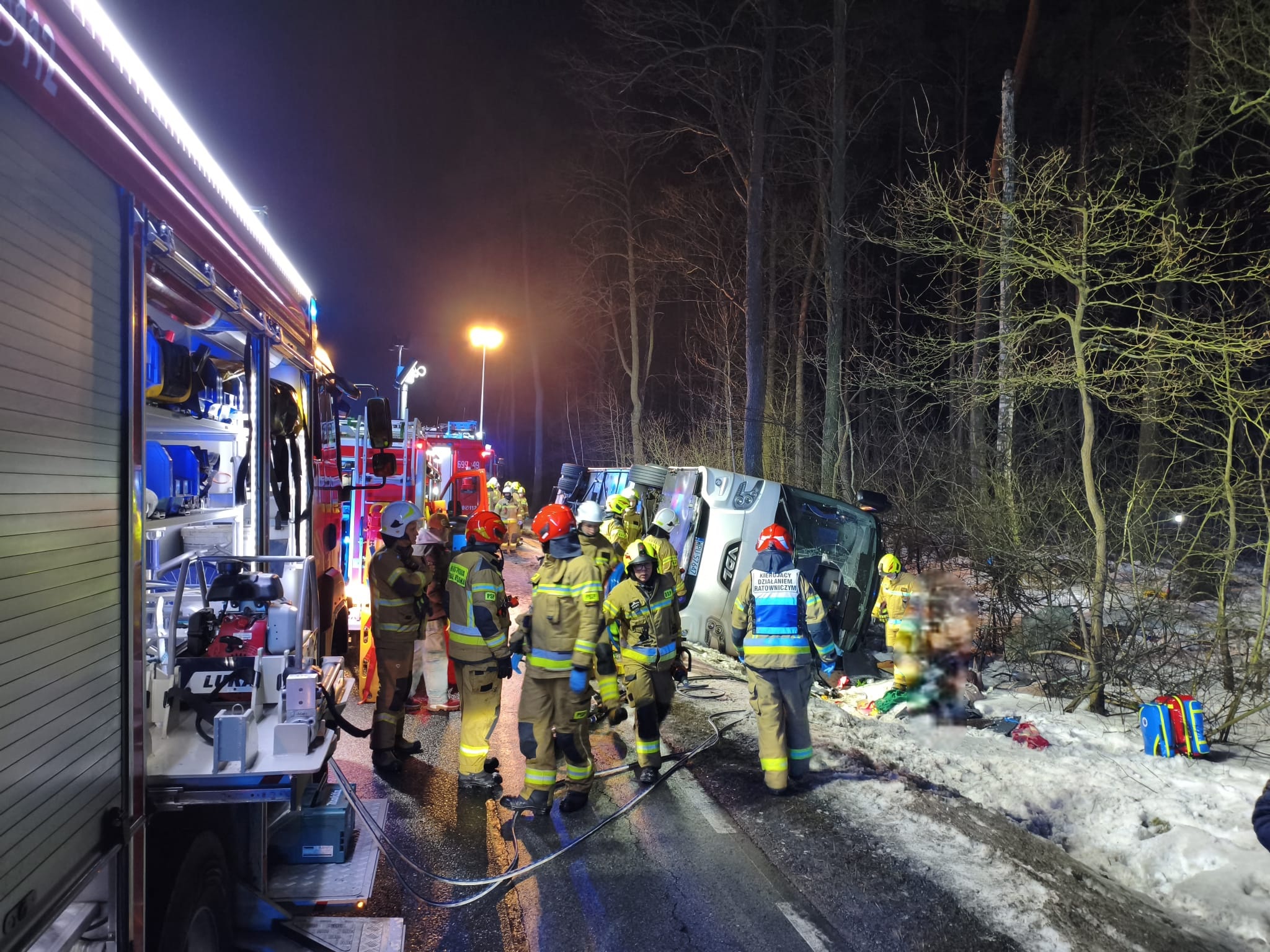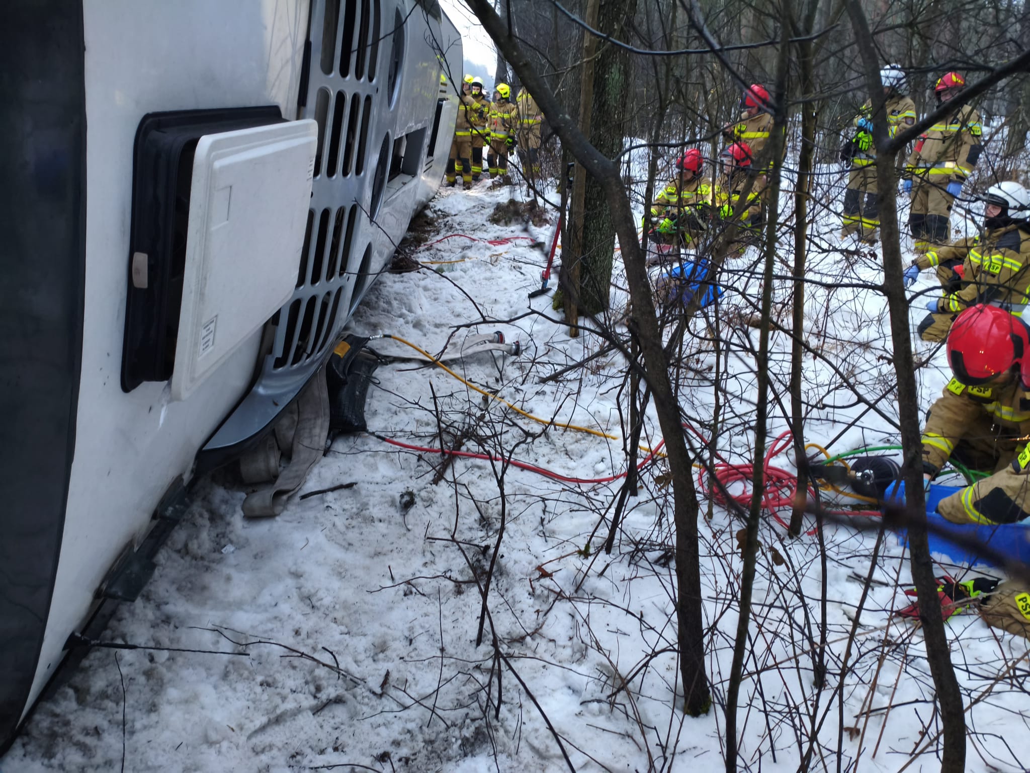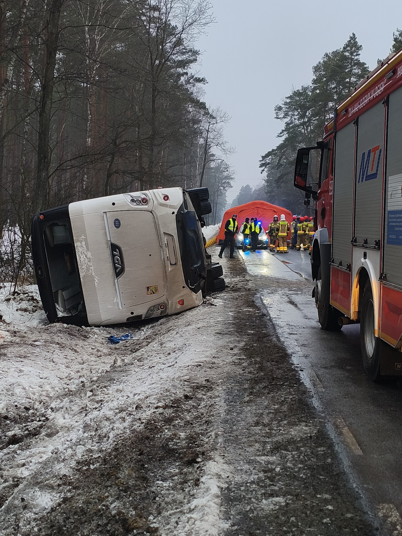 Dramatyczny poranek na DK-62. Autobus z 32 osobami przewrócił się w lesie.