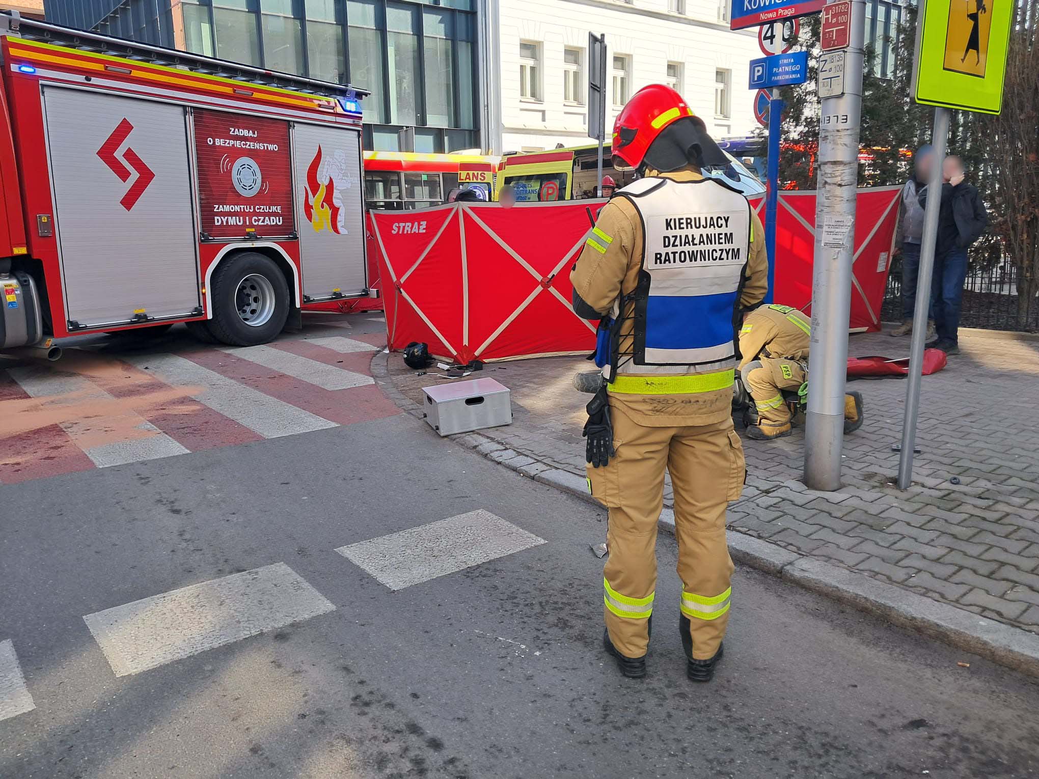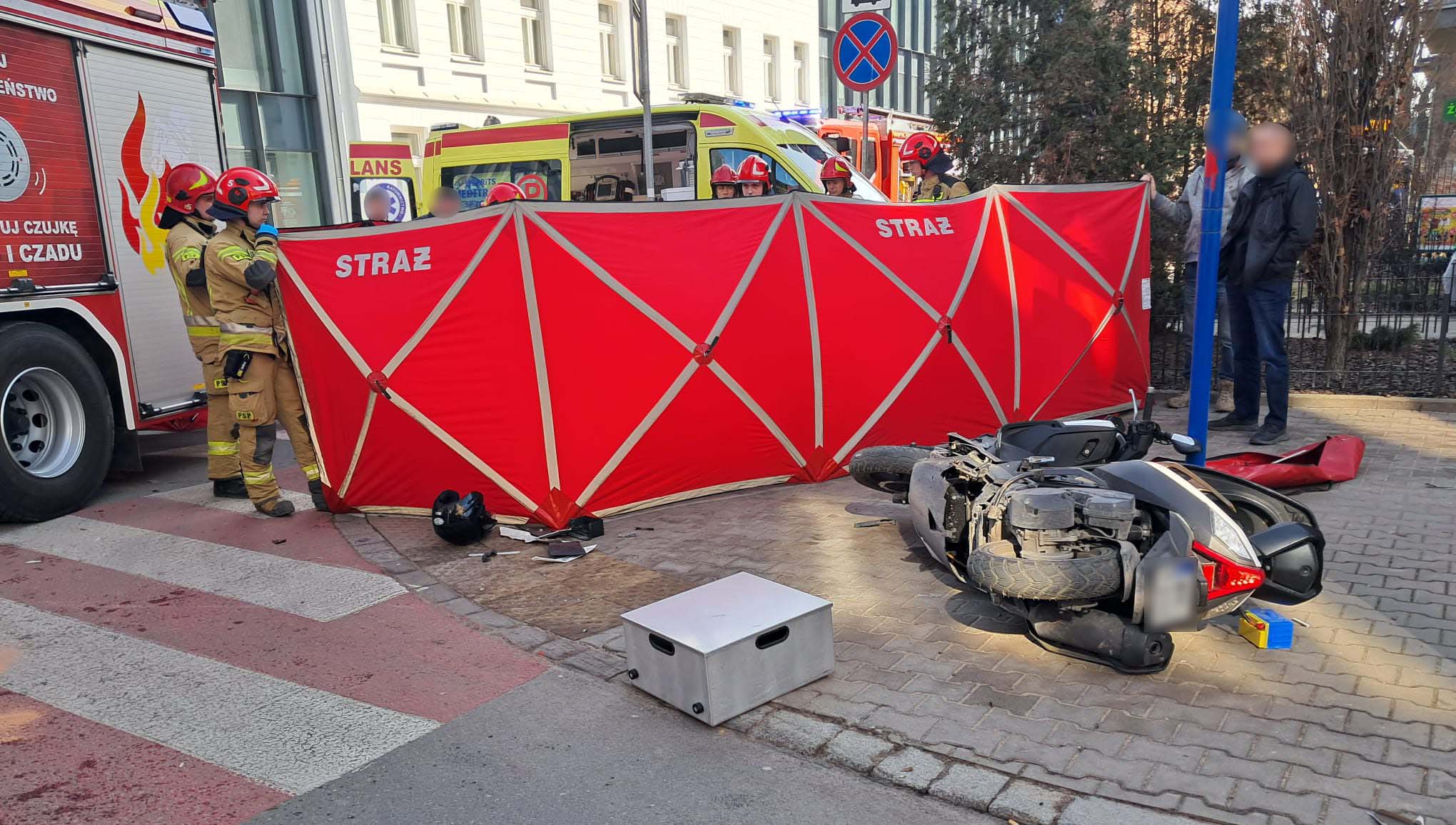 Po przybyciu pierwszego zastępu straży pożarnej zastano dramatyczny widok. Kierowca samochodu osobowego znajdował się już poza pojazdem i – jak ustalono – nie odniósł obrażeń wymagających pomocy medycznej. Znacznie poważniej wyglądała sytuacja kierującego skuterem. Mężczyzna leżał na chodniku i potrzebował natychmiastowej interwencji ratowników.