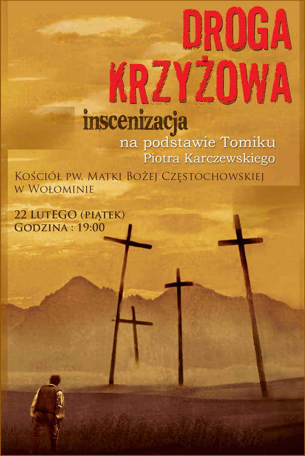 kopia.jpg22 lutego w kościele pw. Matki Boskiej Częstochowskiej (ul. Kościelna 54) w Wołominie będzie miała miejsce inscenizacja Drogi Krzyżowej na podstawie tomiku Piotra Karczewskiego. Jest to świeżo wydany zbiór wierszy opisujących wydarzenia przy kolejnych stacjach oraz modlitw – osobistych spojrzeń wgłąb ludzkiej duszy. Serdecznie zapraszamy wszystkich do poświęcenia tego piątkowego wieczoru na spotkanie z wiarą oraz polecamy uwadze sam tomik, który jest dostępny w Księgarni Religijnej na ul. Kościelnej 8 oraz w Internecie (http://www.apostolicum.pl/shop/?p=2&id_product=425)