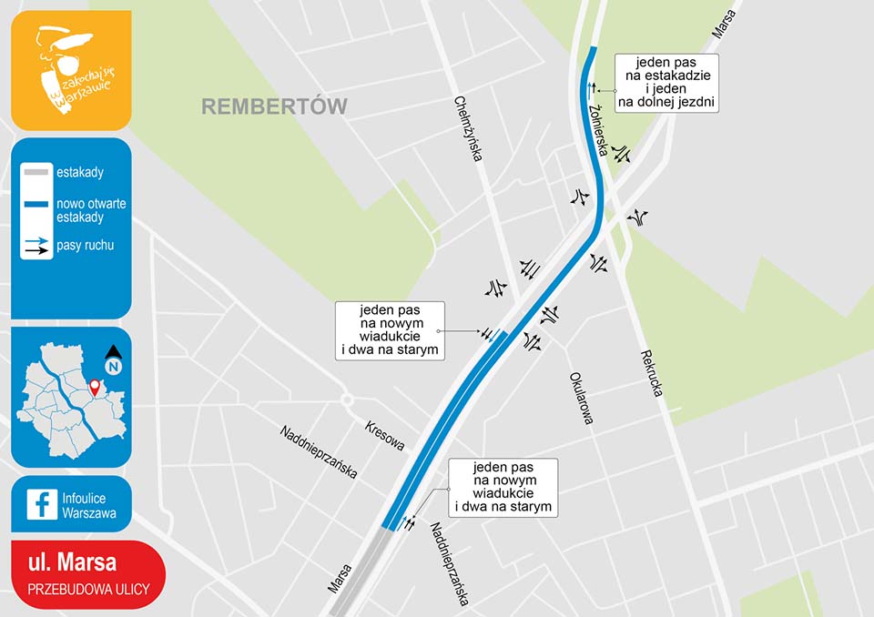 W piątek, 26 kwietnia, ok. godz. 22.00 kierowcy pojadą nowo wybudowanymi estakadami w ciągu ul. Marsa. Otwarte zostaną dwa wiadukty nad torami kolejowymi (pomiędzy ulicami Chełmżyńską i Naddnieprzańską). Kierowcy będą mieli na razie do dyspozycji po jednym pasie w każdym kierunku. Równocześnie udostępniona kierowcom zostanie estakada, dzięki której będzie można bezkolizyjnie pojechać z ul. Marsa (od strony Trasy Siekierkowskiej) w ul. Żołnierską.