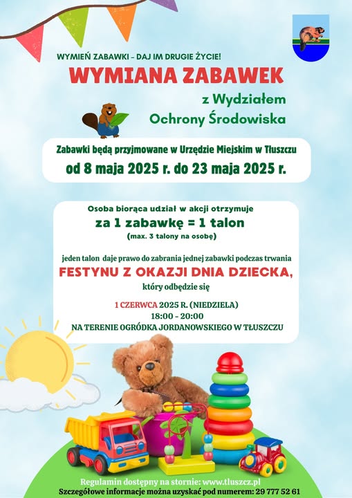 W Tłuszczu trwa inicjatywa, która łączy dbałość o środowisko z radością dziecięcej zabawy. Doi 23 maja mieszkańcy mogą wziąć udział w Akcji Wymiany Zabawek organizowanej przez Wydział Ochrony Środowiska Urzędu Miejskiego. Finałem przedsięwzięcia będzie wydarzenie plenerowe z okazji Dnia Dziecka, podczas którego talony otrzymane za przyniesione zabawki będzie można wymienić na nowe zabawki.
