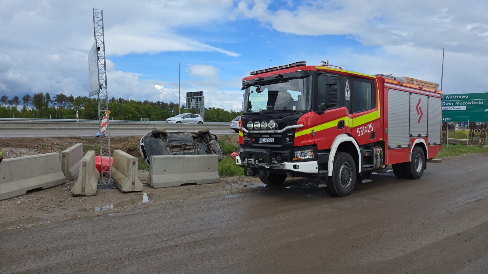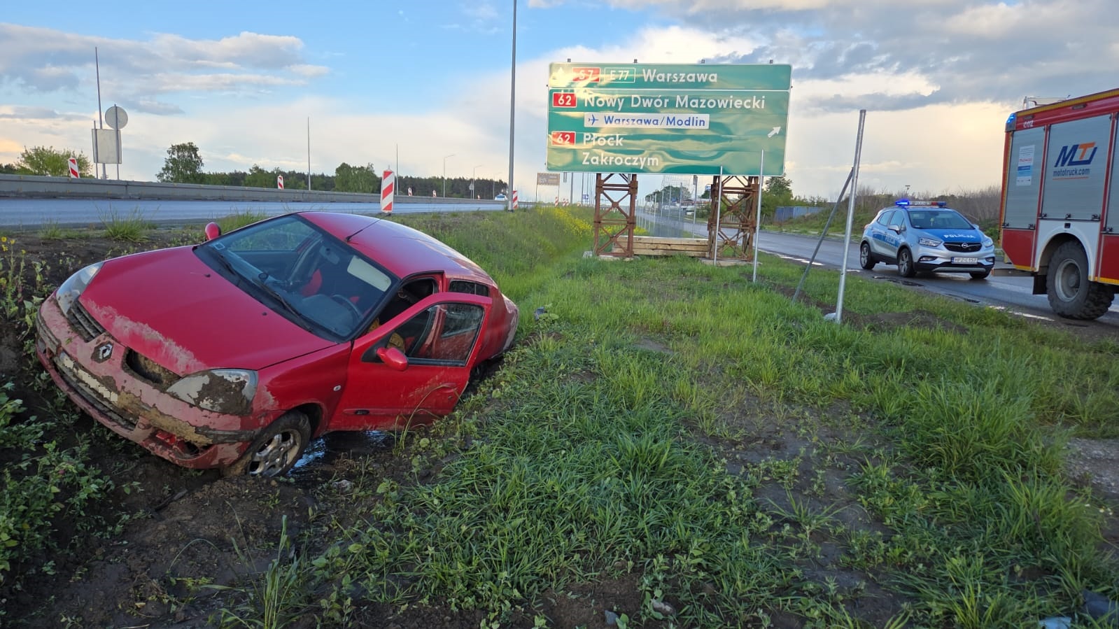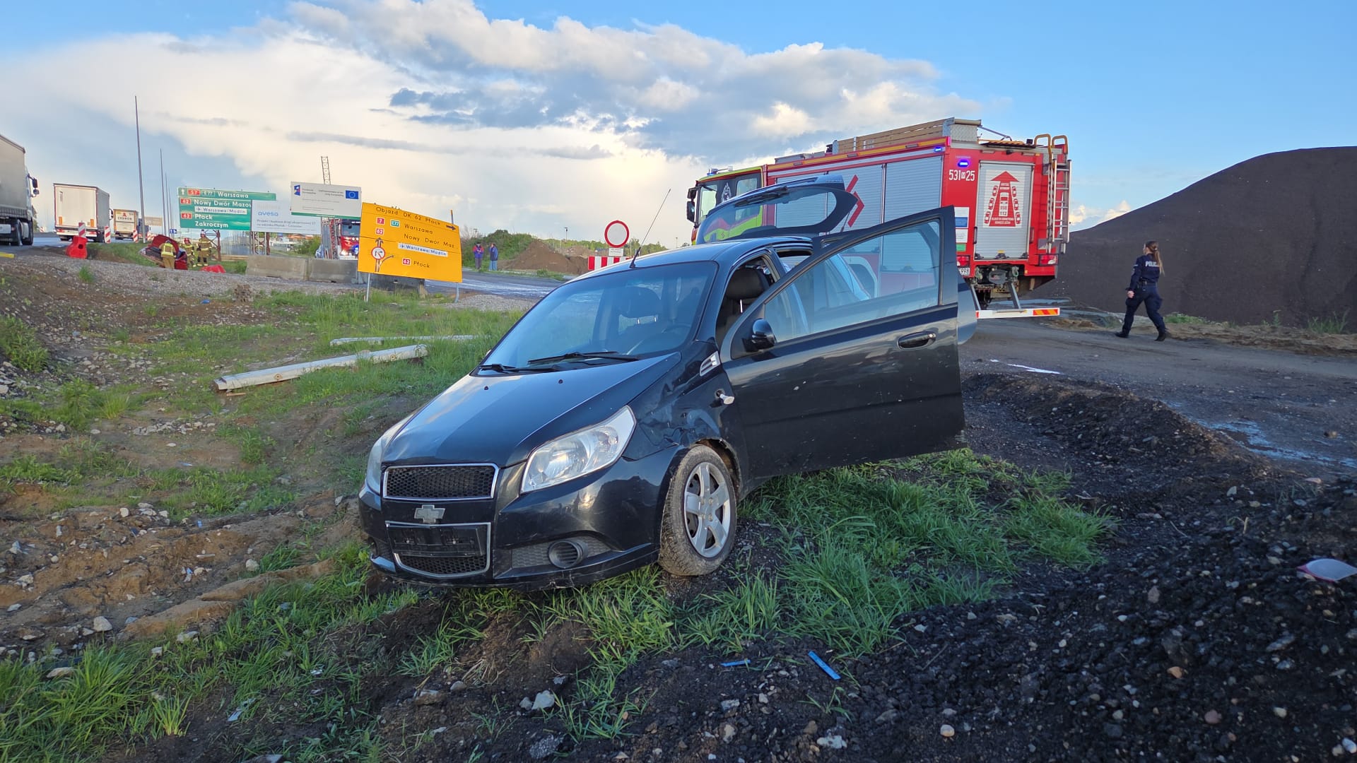 Wkrótce po zakończeniu działań przy pierwszym zdarzeniu, służby otrzymały kolejne zgłoszenie – tym razem dotyczące pojedynczego pojazdu, który również uległ kolizji na tej samej trasie. Na miejscu ponownie interweniowali strażacy z JRG NDM i OSP Zakroczym, a tym razem dodatkowo wezwano Zespół Ratownictwa Medycznego, choć – na szczęście – nie było potrzeby hospitalizacji uczestników.
