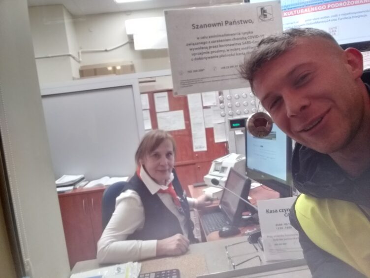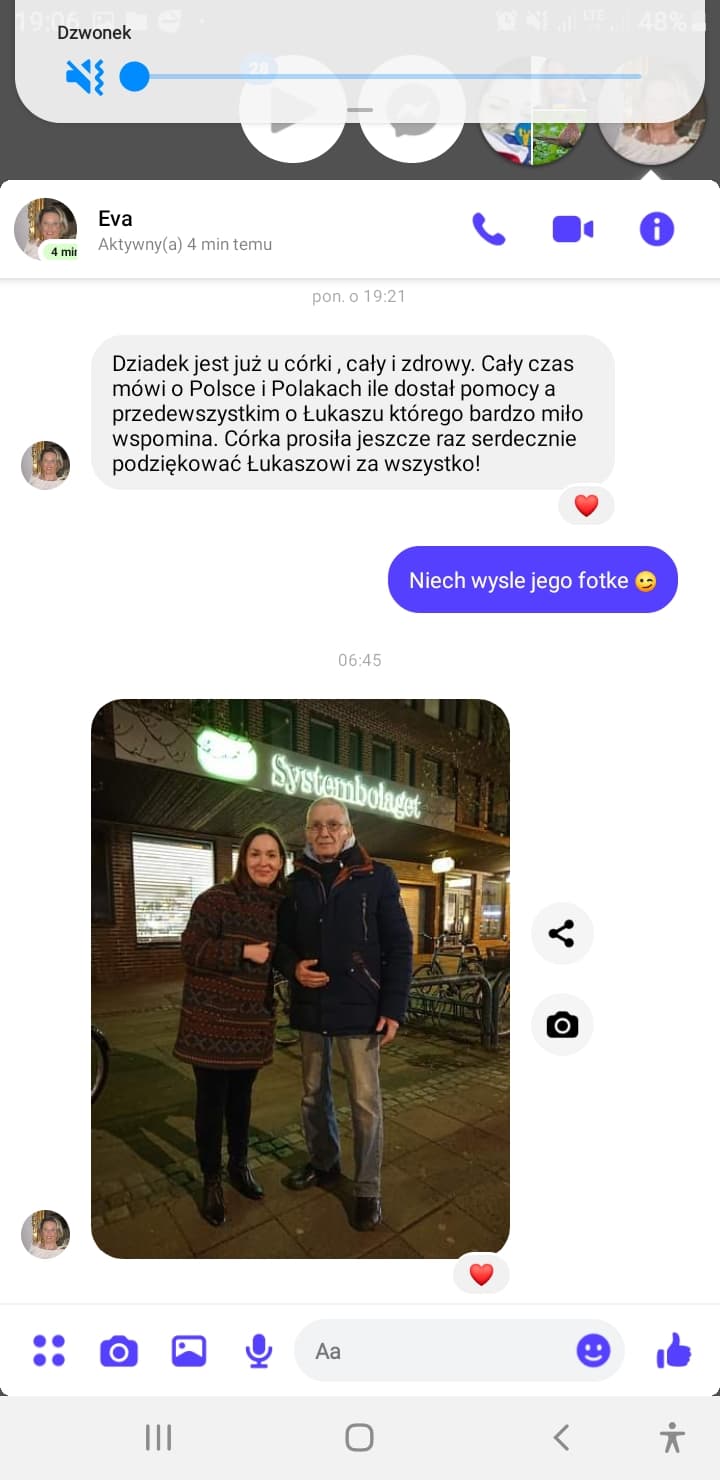 Zdarzały się również zabawne sytuacje. W pierwszych dniach mojego wolontariatu wysiadająca z pociągu z Ukrainy starsza pani zapytała mnie, z którego peronu odjeżdża pociąg do Toronto ?. Była też smutna historia, gdy niesłyszący senior samodzielnie wyprawił się do mieszkającej w Szwecji córki. W tym przypadku wszelkie odpowiedzi pisaliśmy mu na kartce, zakwaterowaliśmy go u nas, w Domu Ukraińskim i załatwiliśmy mu transport. Tak się szczęśliwie złożyło, że mam rodzinę w Szwecji, która skontaktowała się z jego córką i wspólnie koordynowali jego dalszą drogę przez morze. Ta historia dobrze się zakończyła i nawet otrzymałem zdjęcie z informacją, że dotarł szczęśliwie (załączam zdjęcie).