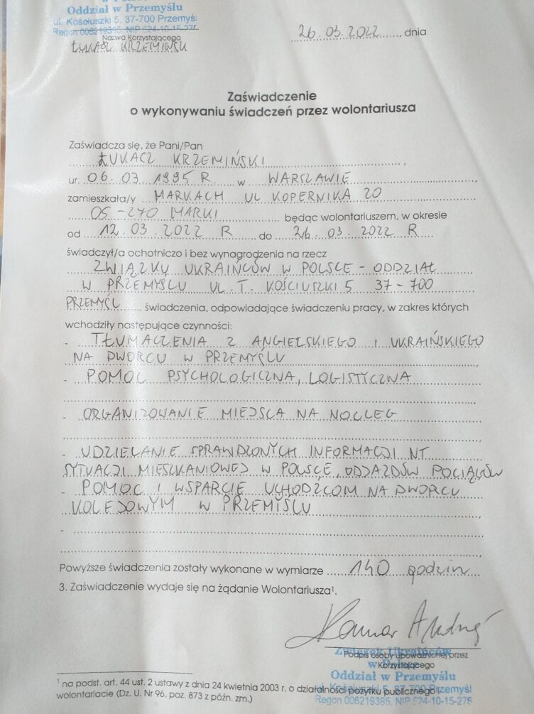 Kończąc – pomaganie jest uzależniające, dlatego mieliśmy również rozmowy z psychologami, którzy doradzali nam jak nie zwariować. Jednym ze sposobów był np. spacer po Przemyślu – miasto jest przepiękne. Udało mi się również załatwić sobie rower ze sklepu (nagroda za wolontariat) i w wolnych chwilach starałem się korzystać z uroków miasta i zbierać siły na nocki pełne wrażeń. Co ważne – nie pomagaliśmy tylko uciekającym przed wojną Ukraińcom. To byli ludzie także innych narodowości np. z Wietnamu.