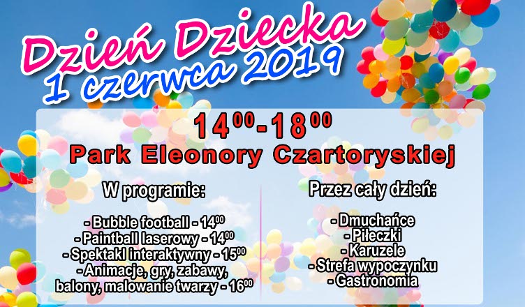 Biblioteka Publiczna Miasta i Gminy Radzymin przygotowała z okazji Dnia Dziecka mnóstwo atrakcji w Parku ks. E. Czartoryskiej w Radzyminie. Na dzieci czekają spektakle interaktywne, Bubble Football, animacje, gry, zabawy, malowanie twarzy.