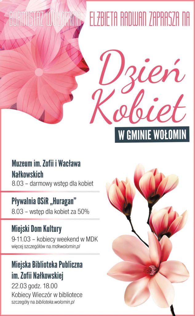 Zgodnie z tradycją rozpoczniemy 8 marca, a zakończymy kobiecym wieczorem w bibliotece 22 marca. W piątek 8 marca warto skorzystać z oferty przygotowanej przez Muzeum im. Zofii i Wacława Nałkowskich, które panie będą mogły zwiedzić za darmo. Pływalnia OSiR ?Huragan? kusi rabatem, dzięki któremu przedstawicielki płci pięknej za wstęp zapłacą tylko połowę ceny.