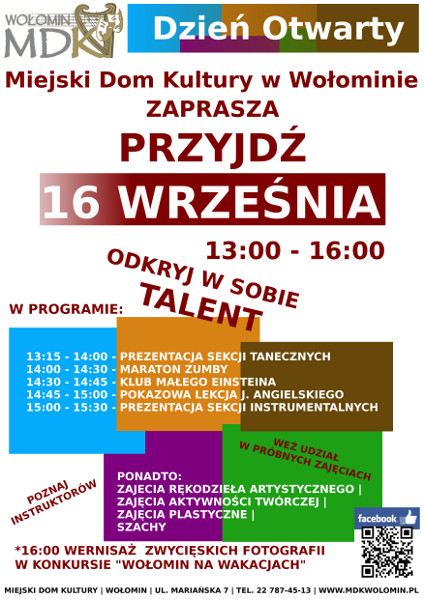 Miejski Dom Kultury w Wołominie zaprasza na dzień otwarty – 16 września między godziną 13.00 a 16.00 będzie się można porozmawiać ze wszystkimi instruktorami prowadzącymi zajęcia w Miejskim Domu Kultury, zobaczyć prezentacje części sekcji, a także wziąć udział w warsztatach promujących niektóre z nich. Dla wszystkich przybyłych gospodarze przygotowali niespodziankę…