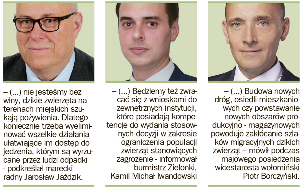 ? Problemy te nasilają się z kliku powodów a jednym z ważniejszych jest dokarmianie dzików przez ludzi oraz szybki rozwój miejscowości na naszym terenie. Budowa nowych dróg, osiedli mieszkaniowych czy powstawanie nowych obszarów produkcyjno-magazynowych. Powoduje to zakłócanie szlaków migracyjnych dzikich zwierząt ? mówił podczas majowego posiedzenia wicestarosta wołomiński, Piotr Borczyński.