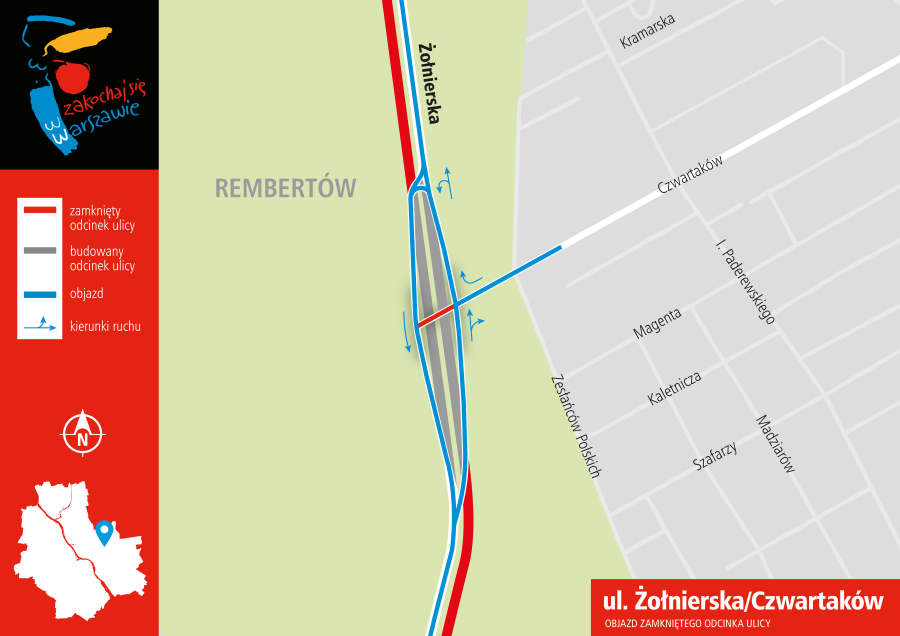 Jak podaje Urząd Miasta Stołecznego Warszawa w nocy z piątku na sobotę (z 25 na 26 sierpnia br ) ruch na ul. Żołnierskiej na odcinku od ul. Marsa do wiaduktu nad torami kolejowymi zostanie przełożony na nowo wybudowaną jezdnię wschodnią. Kierowcy będą mieli na niej do dyspozycji po jednym pasie ruchu w każdym kierunku. Jezdnia zachodnia zostanie zamknięta i rozpocznie się jej przebudowa.
