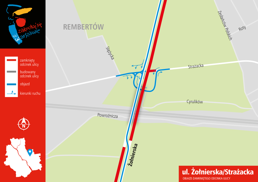 Równocześnie z przełożeniem ruchu na ul. Żołnierskiej wprowadzone będą zmiany na skrzyżowaniach z ulicami Strażacką i Marsa. Na węźle z ul. Strażacką zamknięta dla ruchu zostanie wschodnia jezdnia ul. Żołnierskiej i wlot Strażackiej od strony Starego Rembertowa. Jadąc z tego kierunku trzeba będzie skręcić w lewo i przejechać łącznicą pod wiaduktami ? dalej będzie można pojechać w stronę Targówka lub skręcić na ul. Żołnierską do Marsa. Z kolei jadący ul. Żołnierską od strony ul. Marsa nie będą mogli skręcić w ul. Strażacką w żadnym kierunku. Objazd dla tych relacji zostanie poprowadzony przez ul. Czwartaków. Natomiast jadący od strony Ząbek będą mieli możliwość skrętu w prawo w ul. Strażacką i dalej jazdy w kierunku Targówka lub przejechania łącznicą pod wiaduktami w stronę Rembertowa.