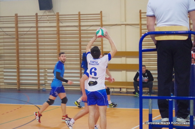 Na początku pierwszego seta utrzymywała się niewielka przewaga gości. Gospodarze kilkukrotnie doprowadzali do remisu: 13:13, 17 17, 18:18, 21:21, ale po tym wracała przewaga drużyny z Wiskitek. Przy stanie meczu 21: 23 jeden z siatkarzy Wichru nawiązał dłuższą rozmowę z arbitrem, za co został ukarany czerwoną kartką, czego wynikiem było przyznanie gościom 24. punktu. W końcówce seta, po ataku Damiana Kacprzaka z Virtusa, było 24:25. Po chwili Kacprzak zdobył kolejny punkt, a set zakończył się wynikiem 24:26.