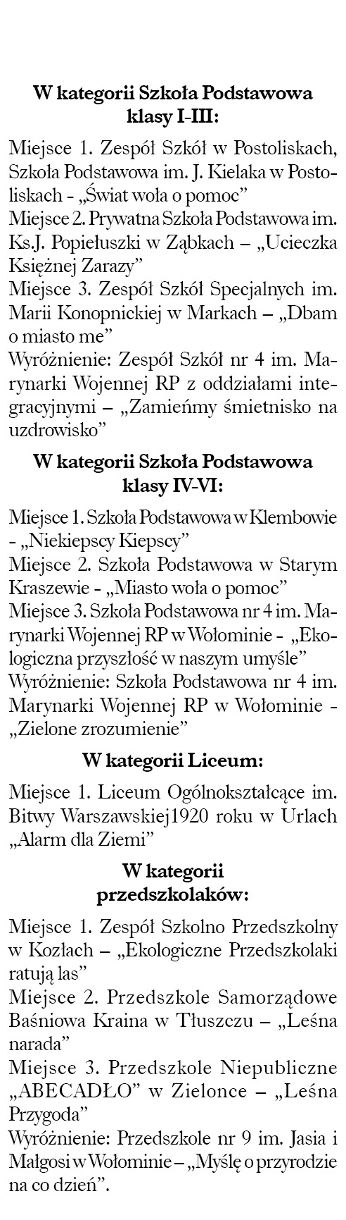 W skłdzie jury Ekologicznego Przeglądu Teatralnego byli: Paweł Ołdak, Anna Mowel, Andrzej Michalik, Katarzyna Moneta. Oklaskom publiczności nie było końca. Oprócz dzieci nagrodzone zostały również ich placówki szkolne, zaś sami laureaci już niedługo wyjadą na atrakcyjne wycieczki do Muzeum Ziemi i do Nadleśnictwa Drewnica na edukacyjną ścieżkę ekologiczną.