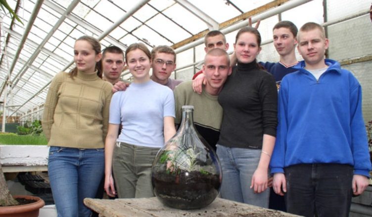 Do naczynia, zwanego gąsiorem, nasypali żwirku, węgla drzewnego i ziemi pomieszanej z torfem, a następnie posadzili w nim rośliny: fikusa, bluszcz, bukszpan i papirus. Całość podleli wodą, a następnie szczelnie zamknęli. Naczynie zostało umieszczone w szkolnej szklarni. Od 15 lat obserwujemy zmiany, jakie dokonują się wewnątrz szklanego ogródka. Bukszpan i bluszcz nie przetrwały drugiego lata, fikus rozrósł się próbując wydostać się przez szyjkę gąsiora na zewnątrz. Z nasion znajdujących się w glebie wykiełkowały chwasty, między innymi koniczyna, a ścianki naczynia zostały oblepione komórkami glonów i śluzowcami. Zakwitła gwiazdnica, której nie miał kto zapylić. Na ściankach naczynia można od wielu lat obserwować liście w różnych stadiach rozkładu oraz rozrastające się łodyżki mchów. Nic nie wskazuje na to, aby maleńki ekosystem miał zniknąć.