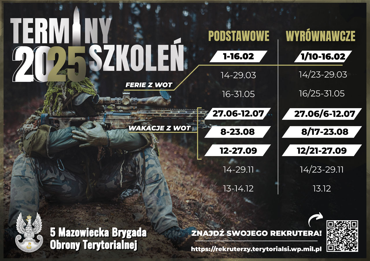 Proces rekrutacji do 5MBOT na szkolenia 16 dniowe – dla osób bez doświadczenia wojskowego oraz szkolenia 8 – dniowe dla żołnierzy rezerwy prowadzony jest całym rokiem. Najbliższe wcielenie do Terytorialnej Służby Wojskowej w Ciechanowie odbędzie się 14 marca br. Zachęcamy do kontaktu z rekruterem Brygady, który pomoże w procedurze rekrutacyjnej i odpowie na wszystkie pytania. Kontakt znajdziesz na stronie https://rekruterzy.terytorialsi.wp.mil.pl