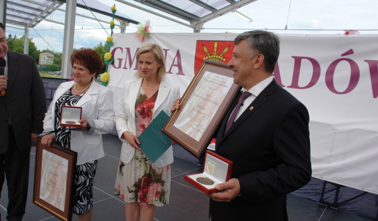 Najważniejszym punktem uroczystości było jednak wręczanie podziękowań i medali pamiątkowych dla samorządowców. Z okazji 25 rocznicy powstania samorządu Wójt Gminy Jadów Dariusz Kokoszka wraz z Przewodniczącą Rady Gminy Jadów Jadwigą Grabską wręczyli podziękowania sołtysom, radnym, pracownikom urzędu, kierownikom jednostek organizacyjnych oraz przybyłym gościom zaproszonym. Marszałek Adam Struzik otrzymał dodatkowo pamiątkowy obraz. Wielkim zaskoczeniem było wręczenie przez Marszałka Adama Struzika i Minister Bożenę Żelazowską dwóch medali ?Pro Masovia?. Jeden wręczono wójtowi Dariuszowi Kokoszce, drugi natomiast Gminie Jadów na ręce przewodniczącej Rady Gminy Jadwigi Grabskiej. Jest to ogromne wyróżnienie, dlatego też nie jedna łza radości zagościła w oczach zebranych. Po części oficjalnej nadszedł czas na tańce przy oprawie ?DUETU GAMA?.