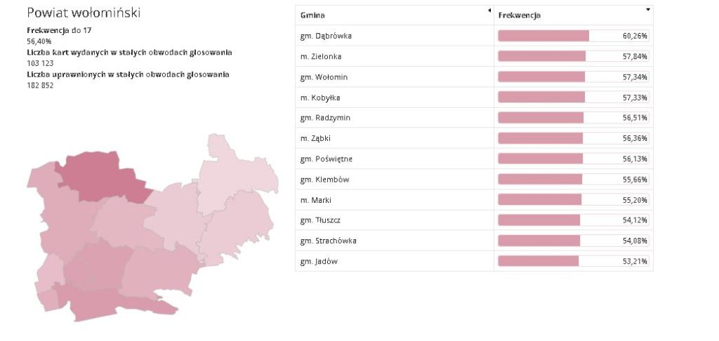 W drugiej turze wyborów prezydenckich frekwencja do godziny 17:00 wynosiła w powiecie wołomińskim 56,40%