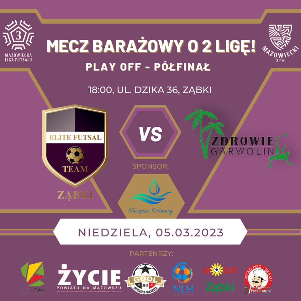 Już w najbliższą Niedziele czekają nas futsalowe emocje w Ząbkach. Nasza drużyna Elite Futsal Team zmierzy się w meczu rewanżowym o wejście do finałów baraży o 2 ligę z drużyną Zdrowie Garwolin.