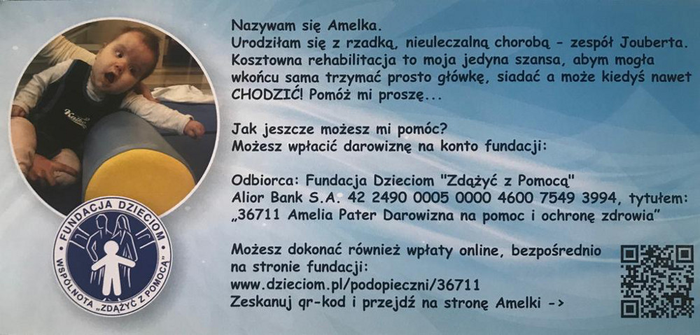 Amelka, córka policjanta naszej komendy, urodziła się z rzadką, nieuleczalną chorobą ?Zespół Jouberta. Choroba ta charakteryzuje się typową wadą móżdżku i pnia mózgu, obniżonym napięciem mięśniowym oraz opóźnionym rozwojem psychoruchowym. Dodatkowo mogą wystąpić zaburzenia funkcji nerek, wątroby oraz siatkówki oka. Amelka wymaga stałej kontroli wielu specjalistów w tym neurochirurga, nefrologa, neurologa, okulisty, genetyka, hepatologa. Wymaga również ciągłych systematycznych niestety kosztownych rehabilitacji, to jedyna szansa, aby zapewnić jej lepsze a w przyszłości samodzielne życie.
