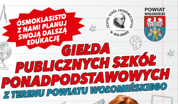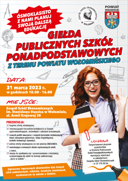 31 marca 2023 r. w godzinach 10.00 – 16.00 w Zespole Szkół Ekonomicznych im. Stanisława Staszica w Wołominie odbędzie się Giełda Publicznych Szkół Ponadpodstawowych prowadzonych na terenie powiatu wołomińskiego.