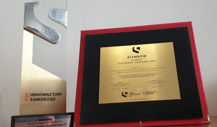 26 lutego br. wręczono nagrody w konkursie ?Innowacyjny Samorząd 2020?, organizowanym przez Serwis Samorządowy Polskiej Agencji Prasowej pod patronatem Ministerstwa Rozwoju, Ministerstwa Cyfryzacji oraz Ministerstwa Funduszy i Polityki Regionalnej. Udział w konkursie okazał się ogromnym sukcesem, ponieważ Gmina Klembów zdobyła w nim I miejsce w kategorii gmin wiejskich!