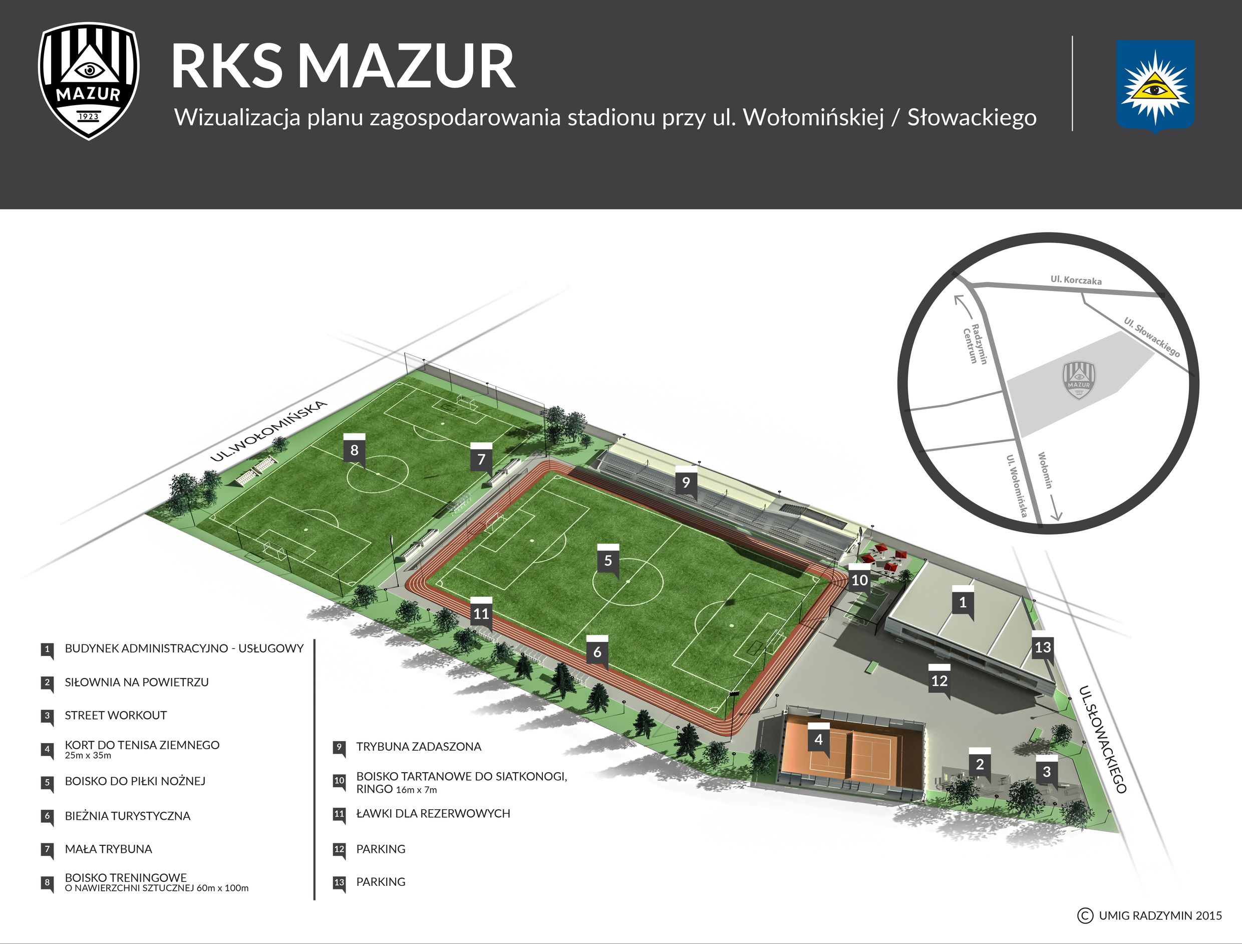 Gminne prace nad modernizacją terenu RKS Mazur Radzymin rozpoczęły się jeszcze w 2015 roku, kiedy przygotowano ogólną, wielobranżową koncepcję zagospodarowania otoczenia stadionu. W czerwcu 2016 roku Burmistrz Radzymina zawarł umowę z projektantem ? biurem projektowym ?DOM-BUD? Stanisław Sójkowski ? na wykonanie projektu kompleksowej modernizacji terenu RKS Mazur. Na podstawie tego projektu gmina Radzymin w czerwcu 2017 r. uzyskała pozwolenie na budowę, które było częścią składową wniosku o dofinansowanie budowy nowego boiska, złożonego do MSiT w dn. 28 marca 2018. Pozytywna decyzja Ministerstwa Sportu i Turystyki z dn. 20 września br. o przyznaniu dofinansowania otwiera drogę do rozpoczęcia budowy nowego boiska treningowego na terenie RKS Mazur.