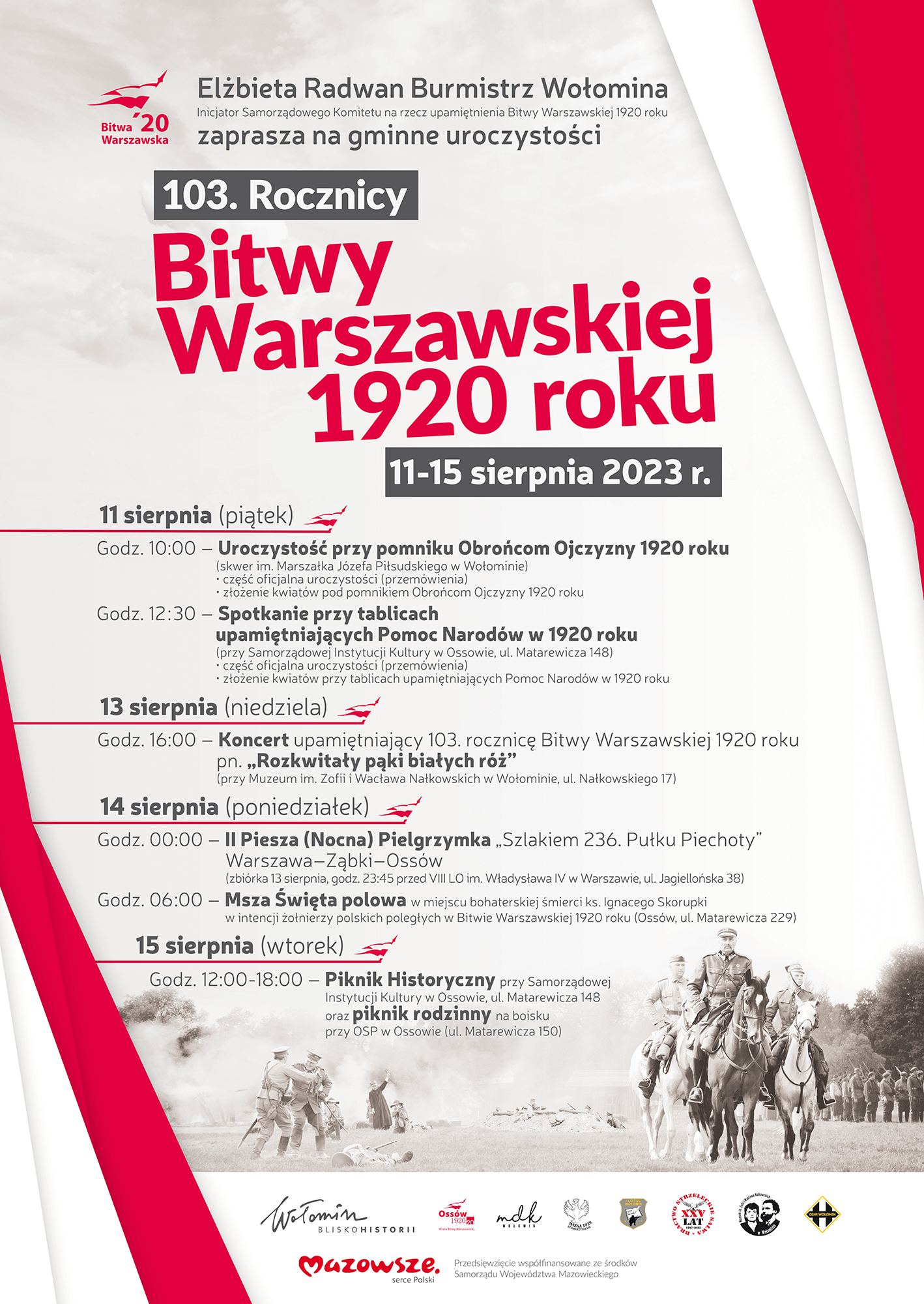 Jak co roku, w rocznicę heroicznych zmagań w obronie naszej niepodległości gmina Wołomin dba o to, by pamięć o Ossowie i Bitwie Warszawskiej była ciągle żywa. Urząd przygotował cztery dni gminnych obchodów z bogatym programem na 103. rocznicę Bitwy Warszawskiej 1920 roku.