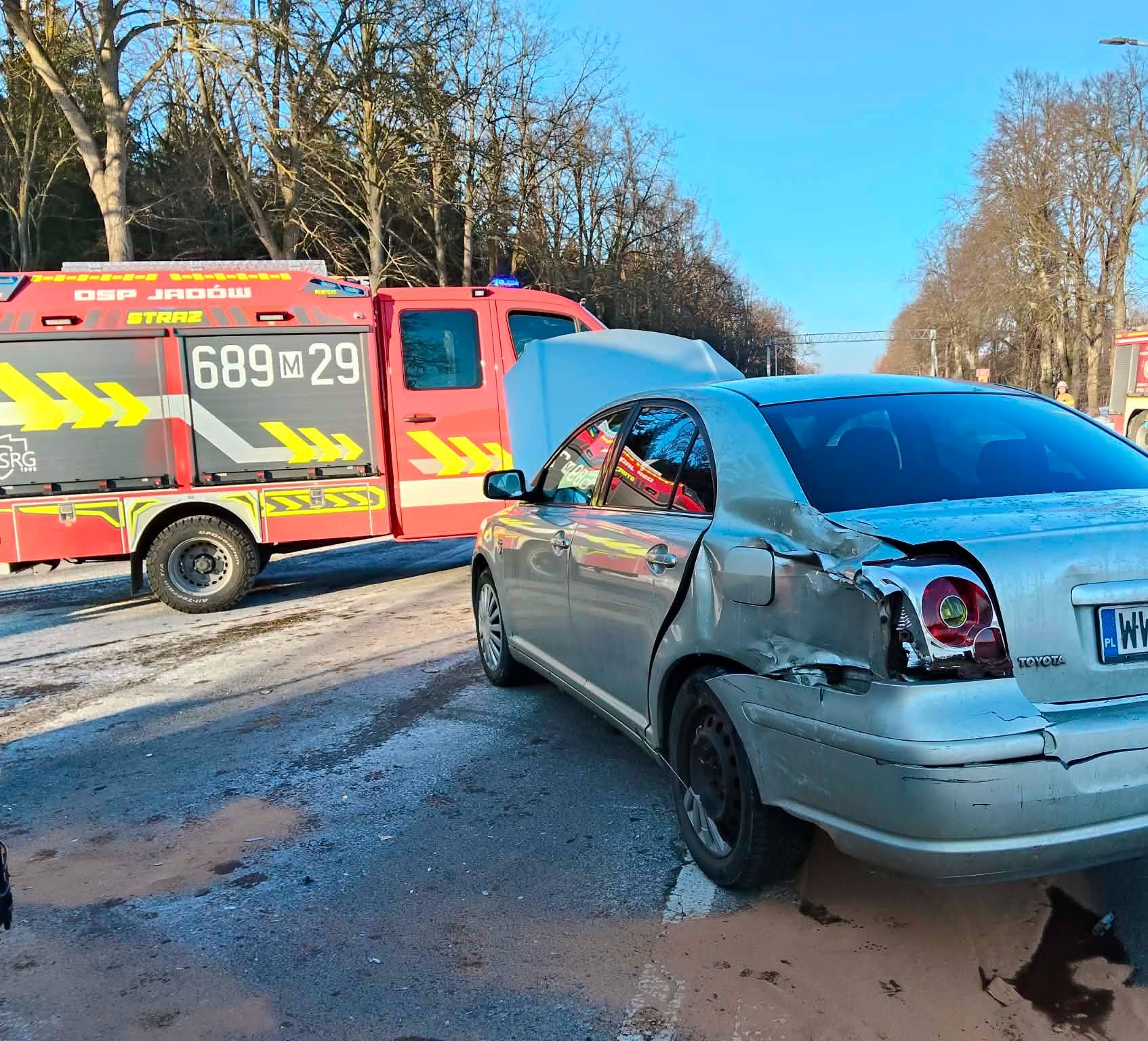 Groźne zderzenie trzech pojazdów w Zawiszynie. Droga zablokowana, jedna osoba ranna