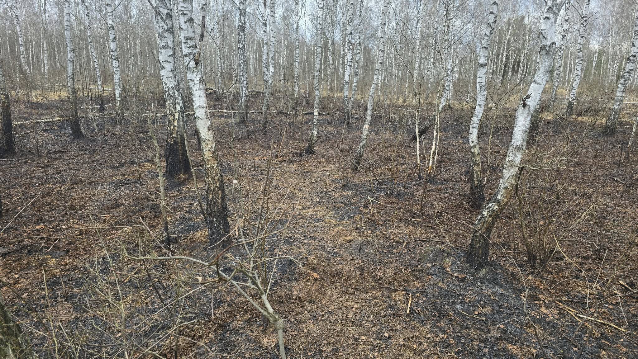 📸 Obraz z miejsca zdarzenia pokazuje zwęgloną ziemię i nadpalone drzewa – to tylko powierzchnia problemu. Największe zagrożenie kryje się pod spodem.