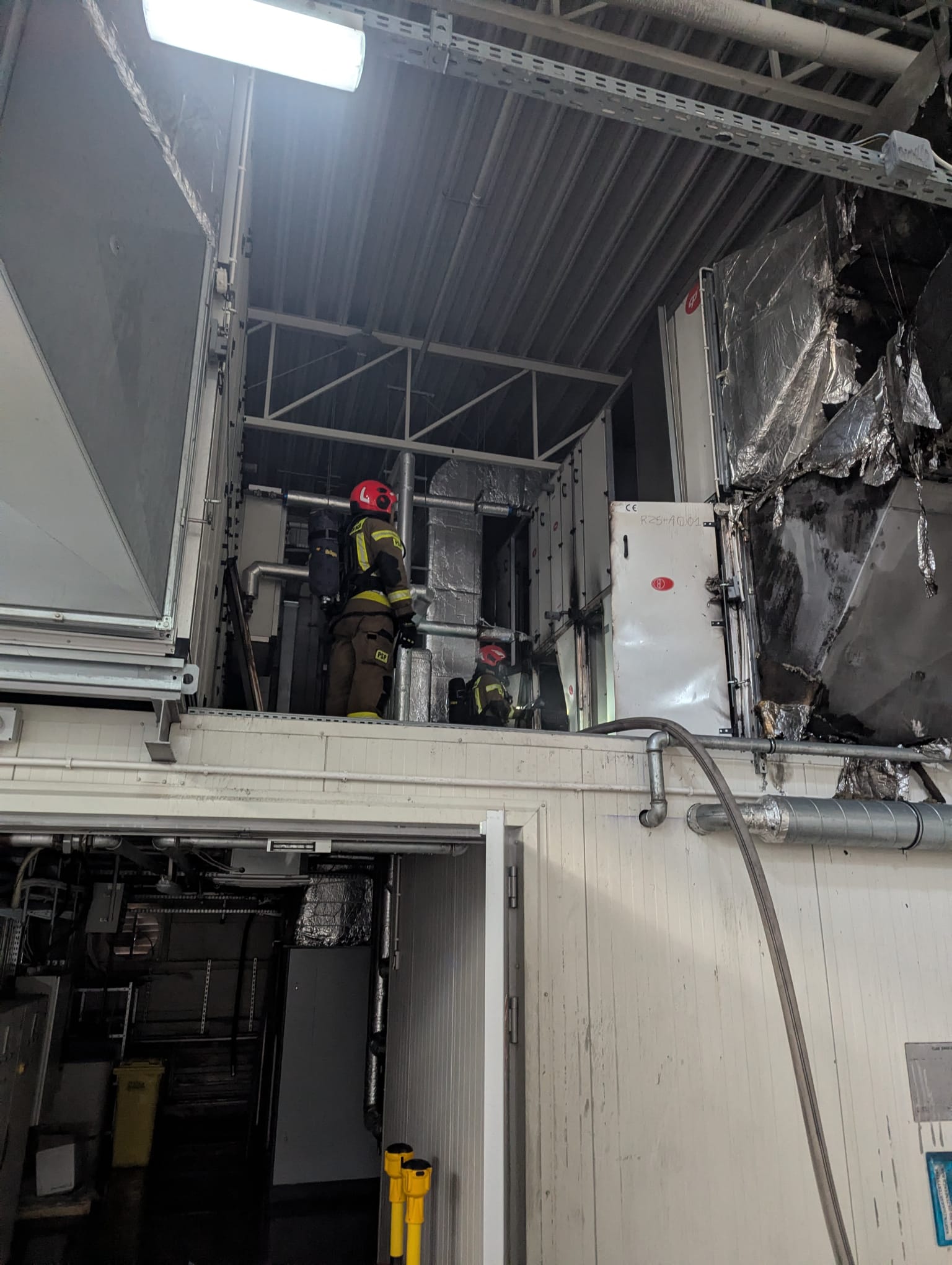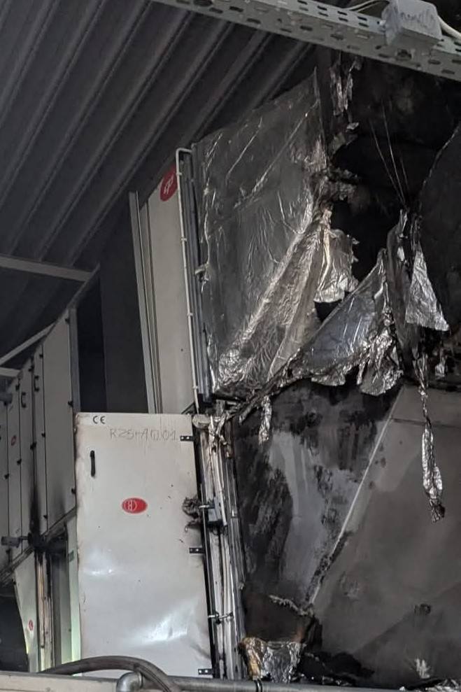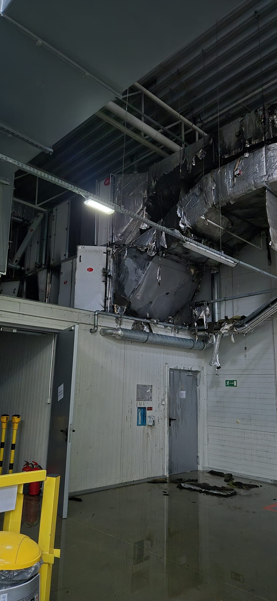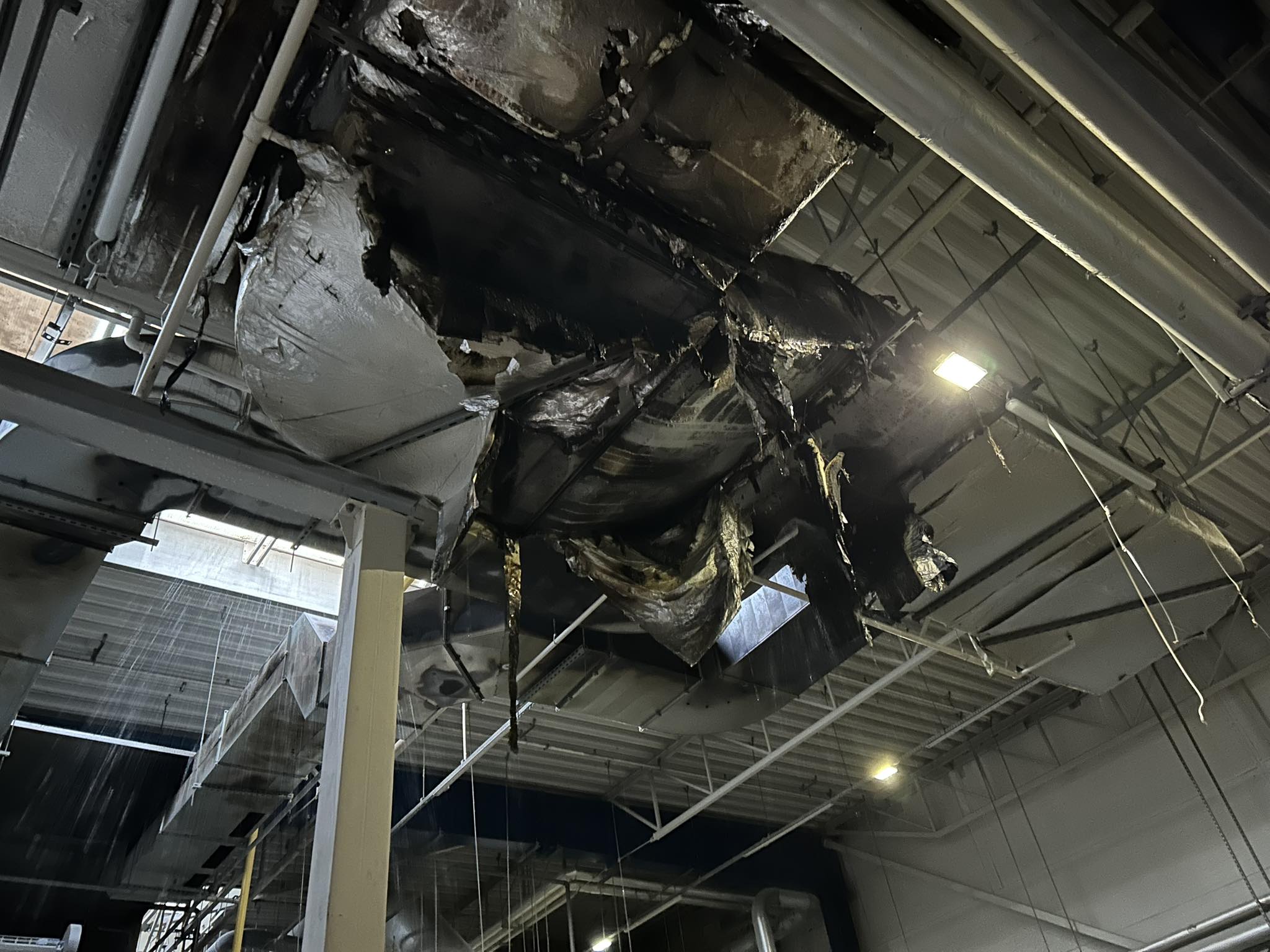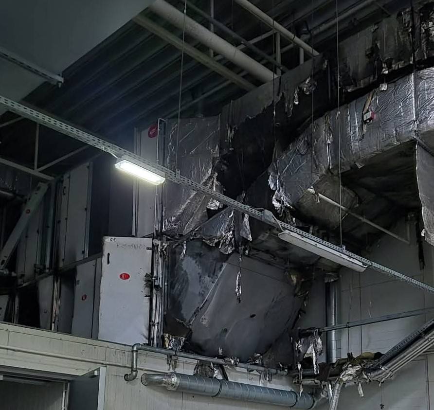 Na miejscu zdarzenia strażacy zastali rozwinięty pożar w obrębie kanałów wentylacyjnych, który – jak widać na udostępnionych zdjęciach – doprowadził do poważnych uszkodzeń infrastruktury podstropowej. Konstrukcja systemu wentylacji została częściowo zniszczona, a fragmenty instalacji uległy stopieniu i zawaleniu. Wysoka temperatura oraz zadymienie stanowiły istotne zagrożenie dla całego obiektu.