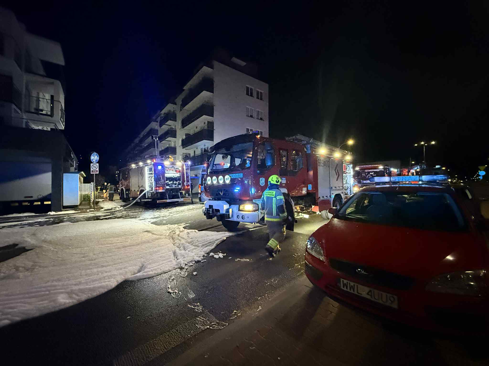 Zgłoszenie o pożarze wpłynęło do służb ratunkowych około godziny 21:30. Po przybyciu pierwszych zastępów straży pożarnej okazało się, że ogień rozwija się wewnątrz garażu podziemnego pod budynkiem mieszkalnym przy ul. Powstańców 27. Szybko rozprzestrzeniające się płomienie oraz intensywne zadymienie znacznie utrudniły działania gaśnicze.
