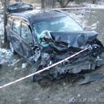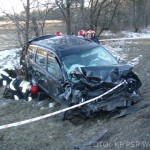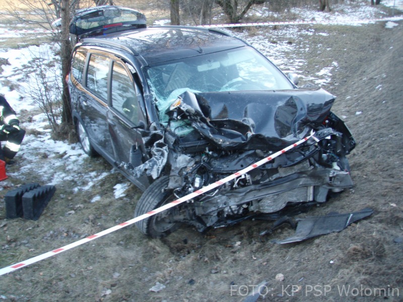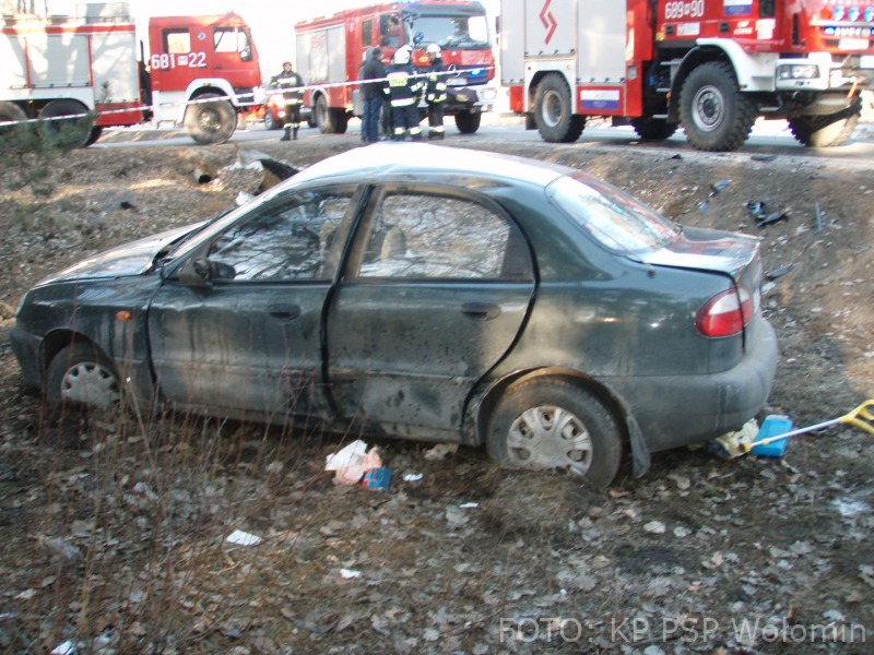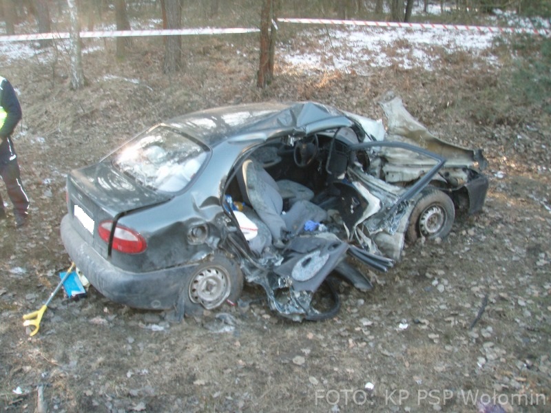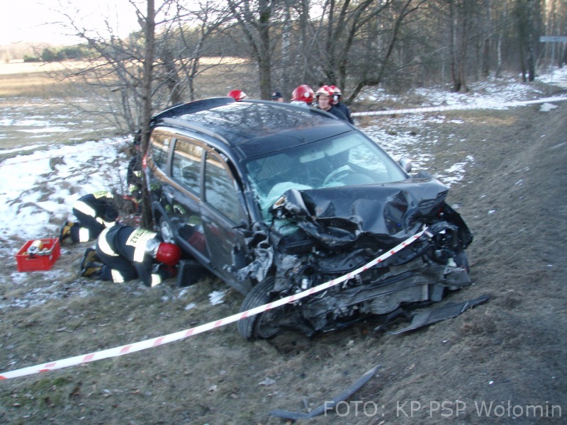 O godzinie 15.18 do Stanowiska Kierowania Komendanta Powiatowego PSP w Wołominie wpłynęło zgłoszenie o zderzeniu 2 samochodów osobowych Daewoo Lanos i Dacia Lodgy. Po przybyciu na miejsce zastępów straży pożarnej pojazdy znajdowały się na poboczu po dwóch stronach drogi. Kierujący Dacią opuścił pojazd o własnych siłach, natomiast 2 osoby poszkodowane z Lanosa zostały ewakuowane przy użyciu sprzętu hydraulicznego przez strażaków. Kierująca i pasażerka zostały przetransportowane do szpitala, w tym jedna przez zespół Lotniczego Pogotowia Ratunkowego. Dalsze działania straży polegały na neutralizacji płynów eksploatacyjnych z rozbitych pojazdów przy użyciu Sorbentu. W działaniach uczestniczyły 2 zastępy z JRG Wołomin, 2 z JRG Mińsk Mazowiecki, OSP Równe, Jadów, Stanisławów, Dobre, karetka, śmigłowiec LPR i 3 radiowozy. Droga wojewódzka 50 w okolicach skrzyżowania na Kąty-Miąski i Flakowiznę została zablokowana do czasu zakończenia czynności prowadzonych przez Policję.