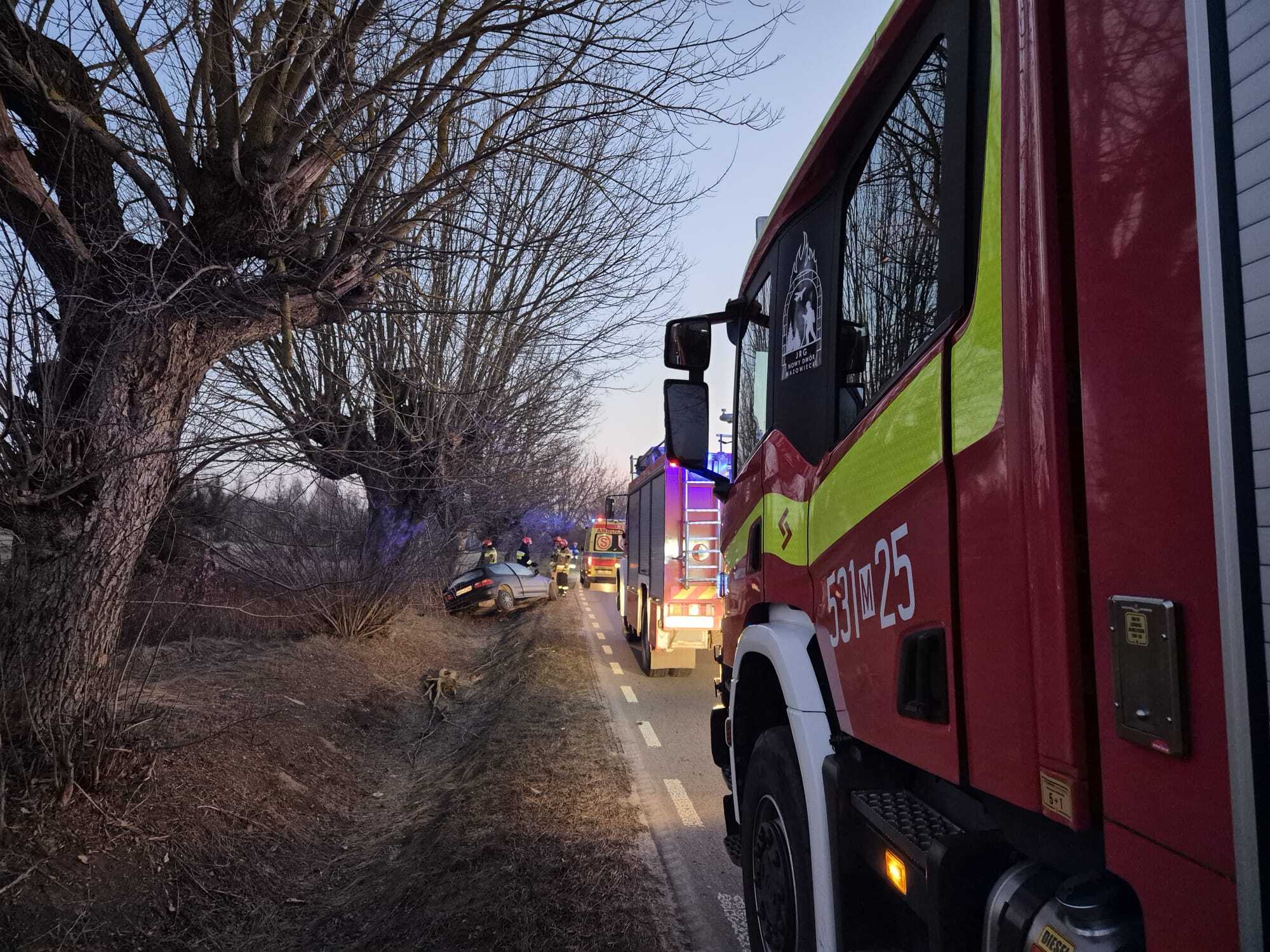Do niebezpiecznego zdarzenia drogowego doszło 26 lutego 2026 roku w miejscowości Psucin. Do Stanowiska Kierowania Komendanta Powiatowego PSP w Nowym Dworze Mazowieckim wpłynęło zgłoszenie o samochodzie osobowym, który wypadł z drogi i uderzył w przydrożne drzewo.