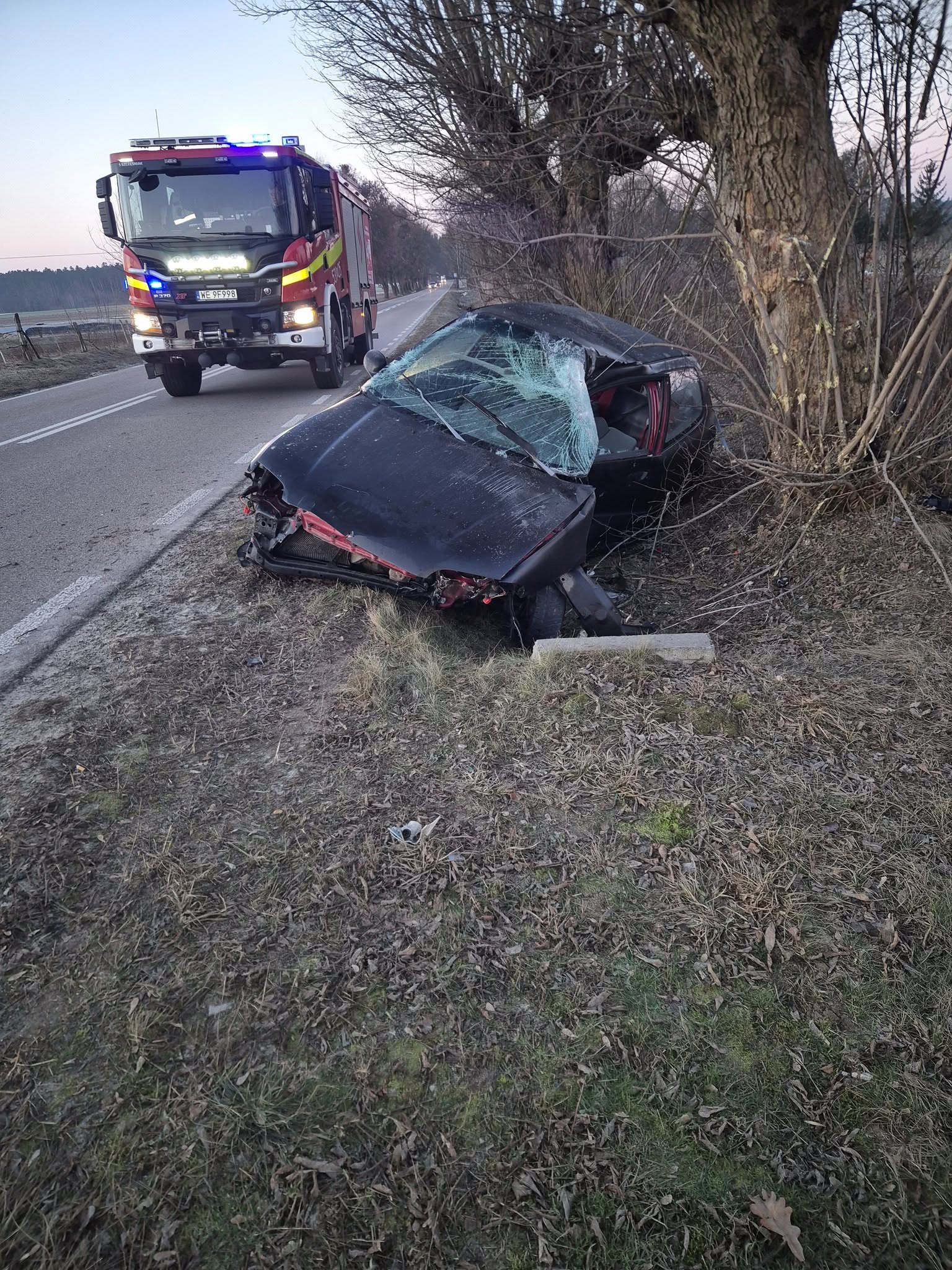Siła zderzenia była znaczna. Na miejscu zastano poważnie uszkodzony pojazd – przód auta został całkowicie zgnieciony, a przednia szyba rozbita. Samochód zatrzymał się tuż przy pniu drzewa, częściowo w przydrożnym rowie. Elementy karoserii były rozrzucone wokół pojazdu, co świadczy o dynamicznym przebiegu zdarzenia.