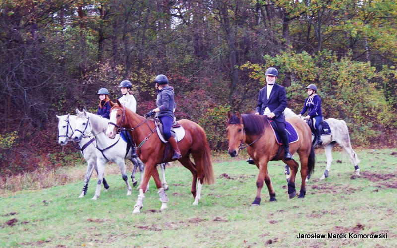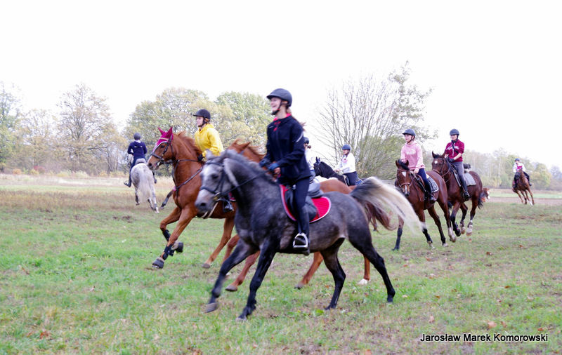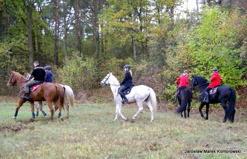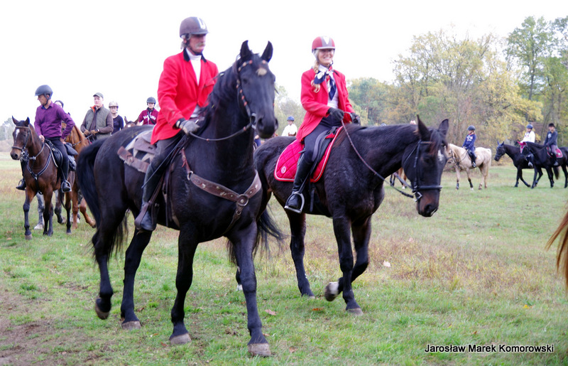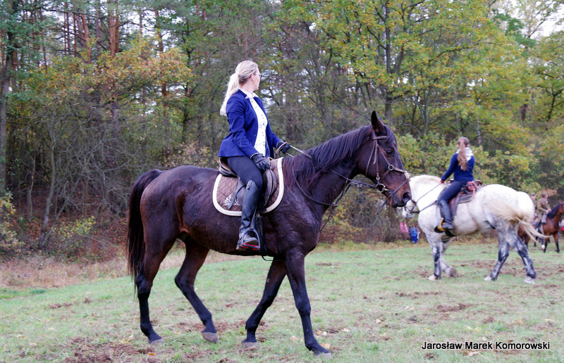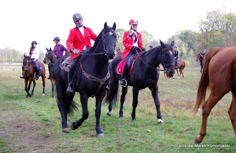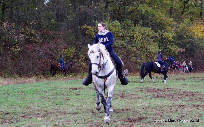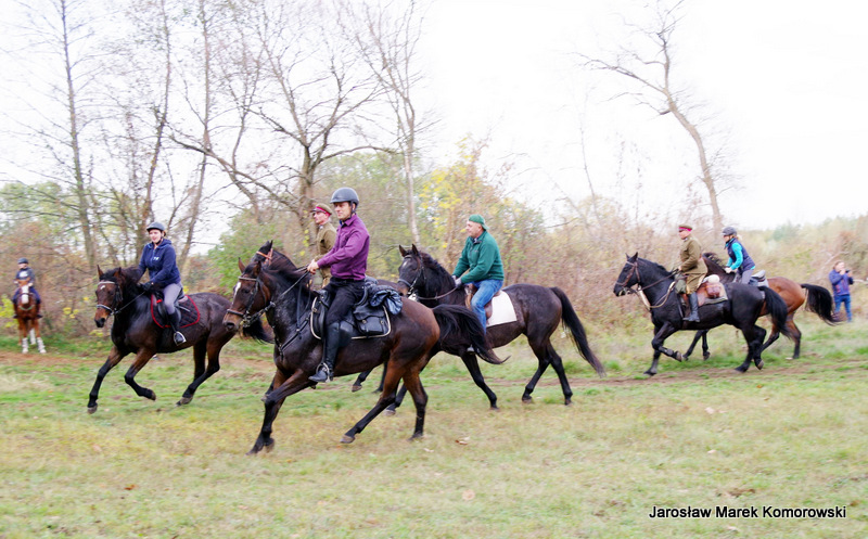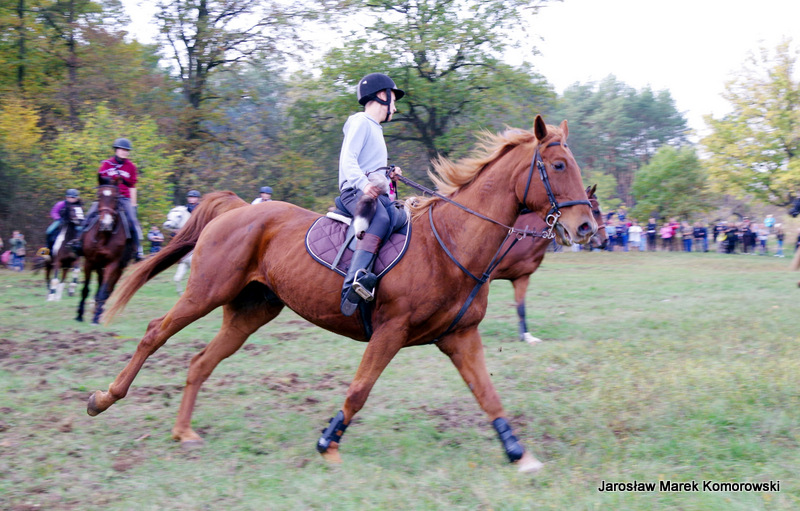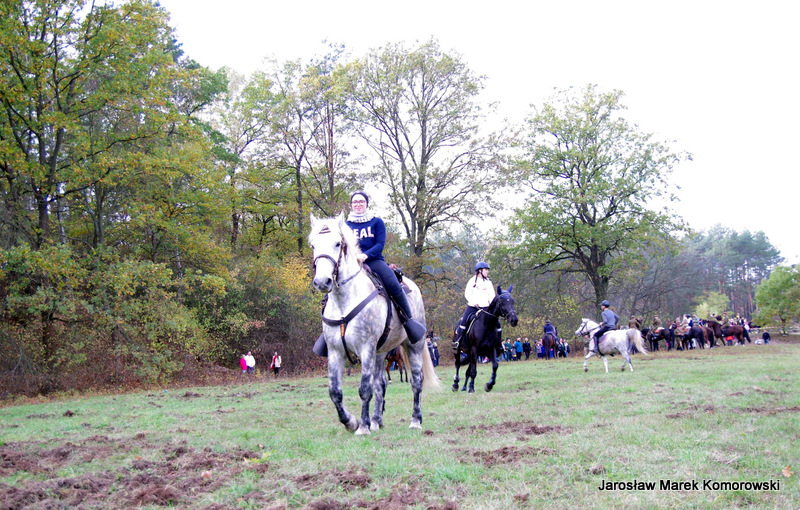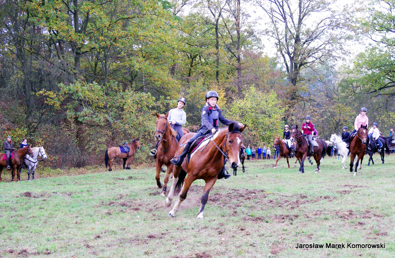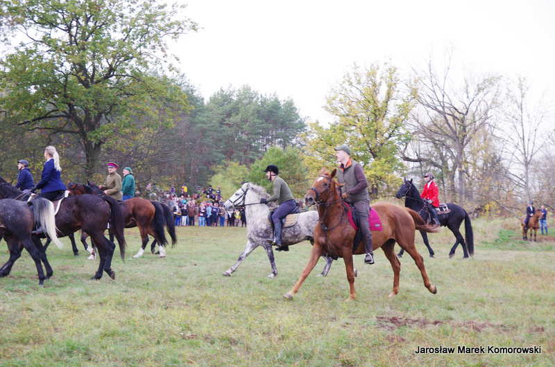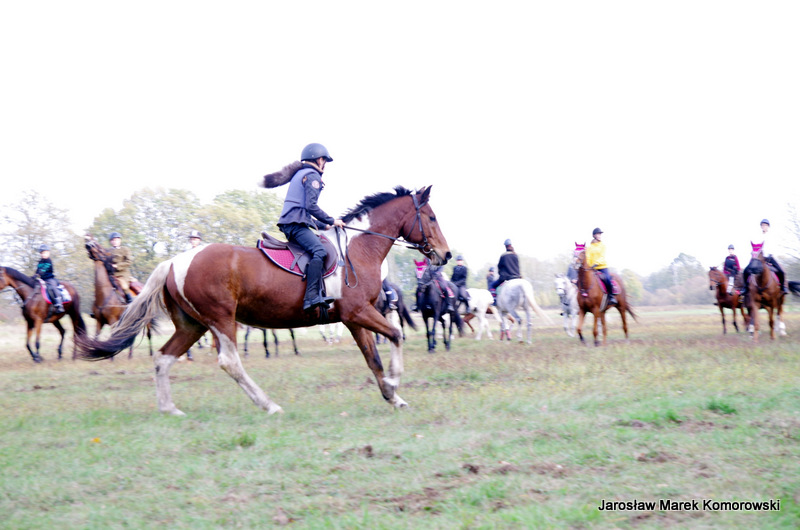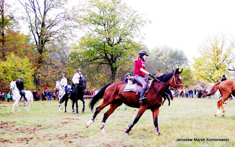 Wśród jeźdźców (Hubertus konny) urządzana jest natomiast tradycyjna gonitwa, która organizowana jest najczęściej na przełomie października i listopada. W trakcie biegu, uczestnicy konno ścigają tzw. Lisa, którym jest jeździec z ogonem przypiętym do lewego ramienia. Osoba, której uda się go zerwać ? wygrywa. Jako zwycięzca ma ona prawo wykonać rundę honorową wokół miejsca pogoni, i za rok sama ucieka jako lis. Często gonitwę poprzedza wspólny teren, który jest także swego rodzaju rozgrzewką dla wszystkich uczestników. Dla najmłodszych adeptów jeździectwa często organizowane są różnego rodzaju gry i zabawy, które polegają na odnalezieniu np. ukrytej lisiej kity. Zabawa kończy się wspólnym biesiadowaniem przy ognisku.