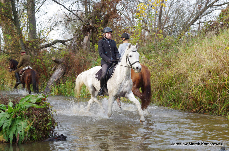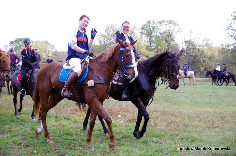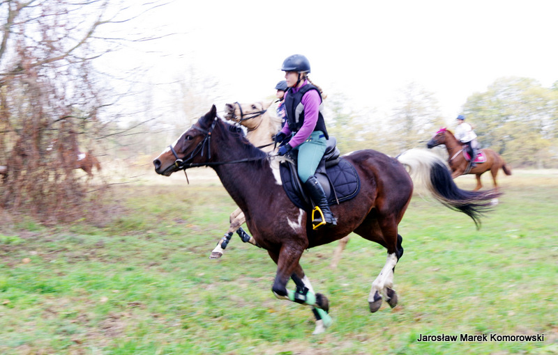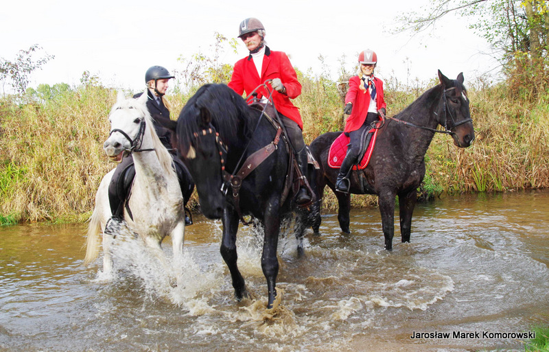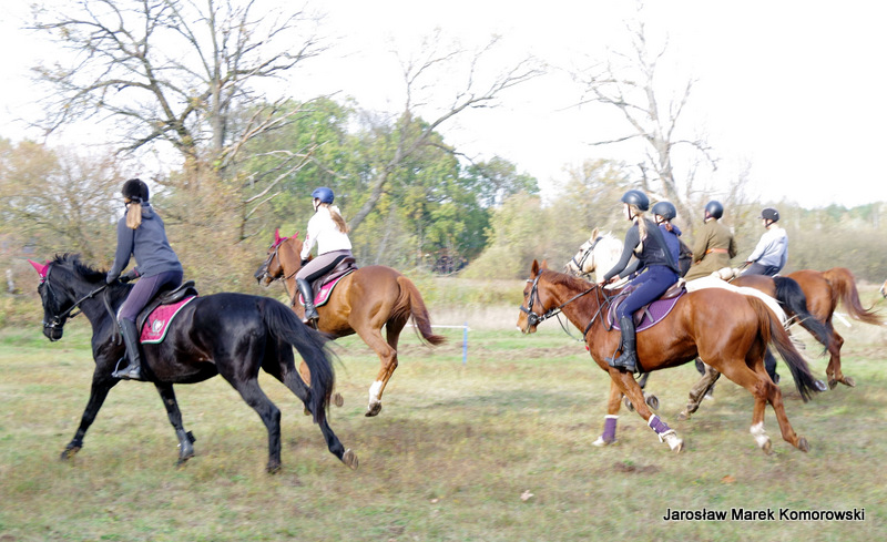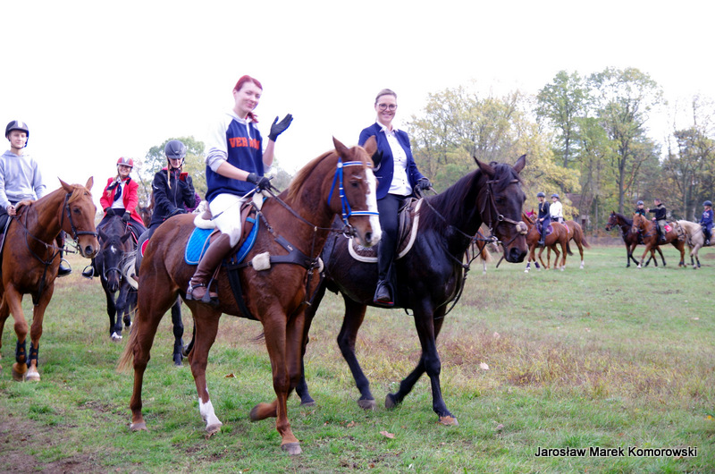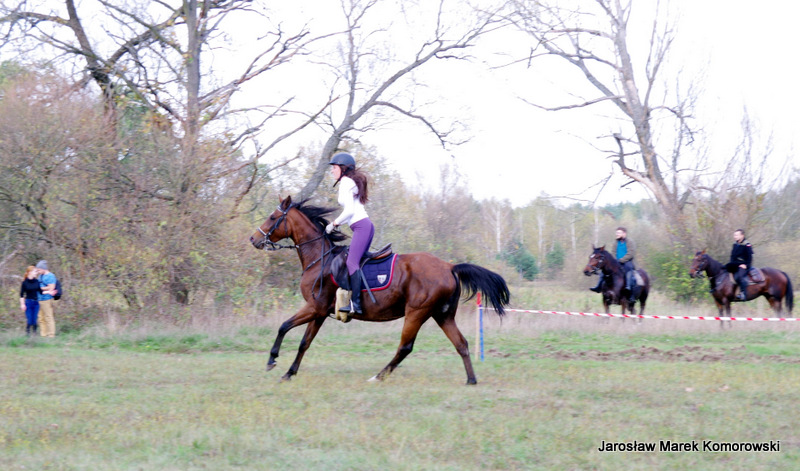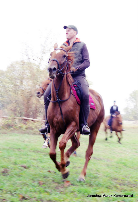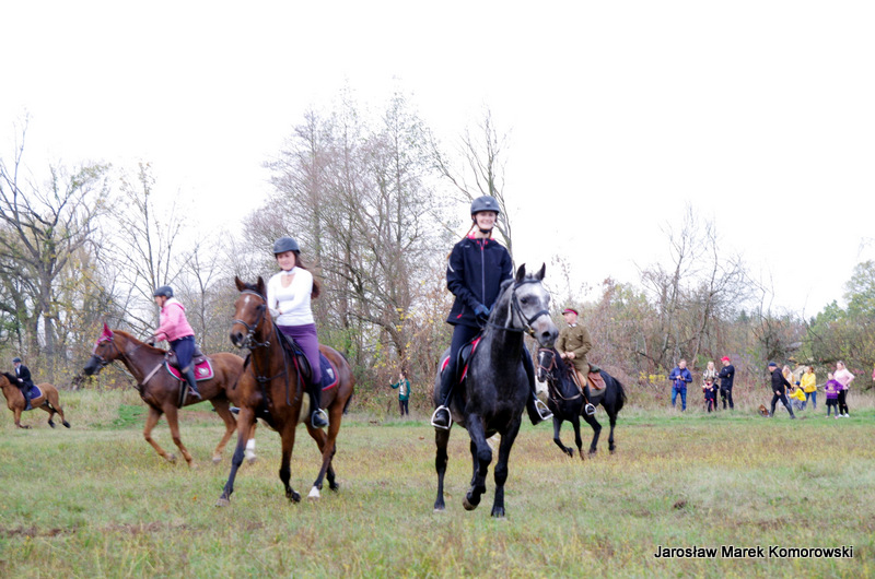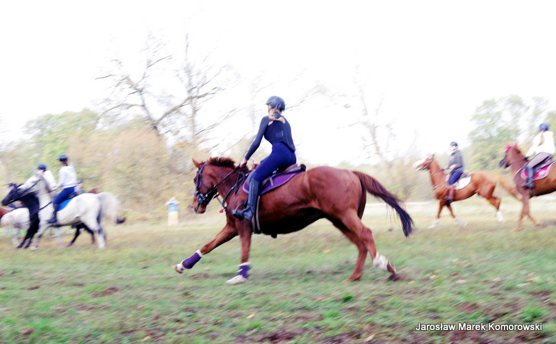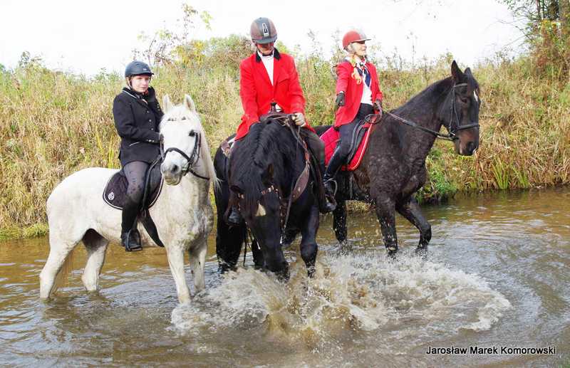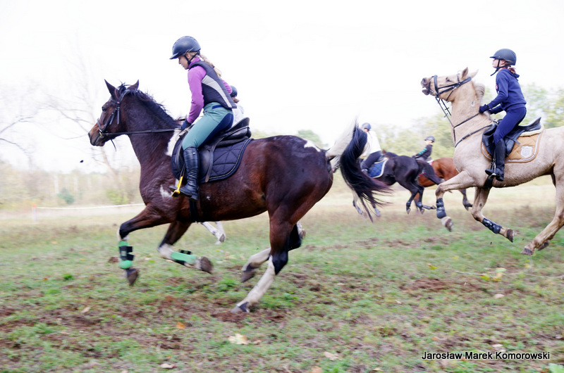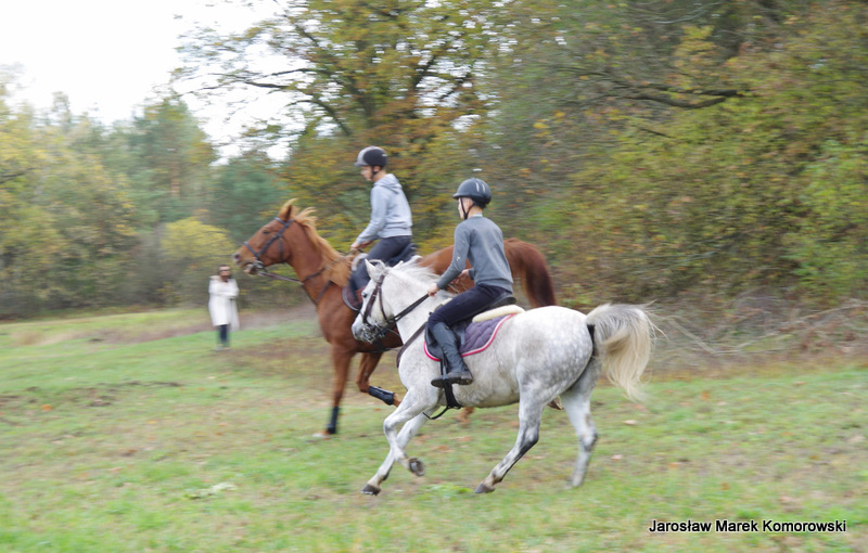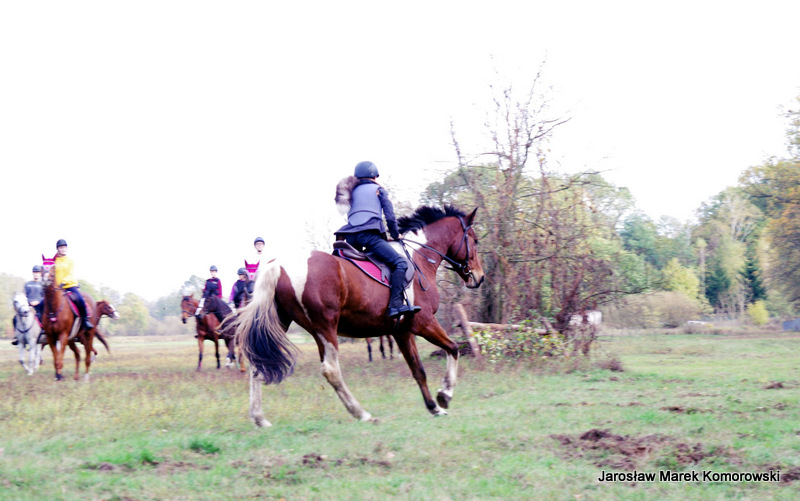 Wśród jeźdźców (Hubertus konny) urządzana jest natomiast tradycyjna gonitwa, która organizowana jest najczęściej na przełomie października i listopada. W trakcie biegu, uczestnicy konno ścigają tzw. Lisa, którym jest jeździec z ogonem przypiętym do lewego ramienia. Osoba, której uda się go zerwać ? wygrywa. Jako zwycięzca ma ona prawo wykonać rundę honorową wokół miejsca pogoni, i za rok sama ucieka jako lis. Często gonitwę poprzedza wspólny teren, który jest także swego rodzaju rozgrzewką dla wszystkich uczestników. Dla najmłodszych adeptów jeździectwa często organizowane są różnego rodzaju gry i zabawy, które polegają na odnalezieniu np. ukrytej lisiej kity. Zabawa kończy się wspólnym biesiadowaniem przy ognisku.