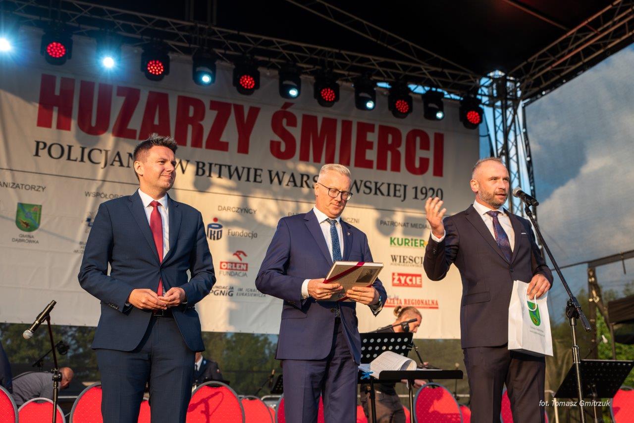 Jako pierwszy, w imieniu Mariusza Kamińskiego ministra MSWiA, głos zabrał Michał Prószyński ? szef Gabinetu Politycznego MSWiA. Następnie odbyły się wystąpienia organizatorów wydarzenia ? Wójta Gminy Dąbrówka Radosława Korzeniewskiego oraz Starosty Wołomińskiego Adama Lubiaka. Na wydarzeniu gościliśmy również Katarzynę Lubiak ? Radną Sejmiku Woj. Mazowieckiego, Wiesława Mędrzyckiego i Cezarego Wnuka ? Wiceprzewodniczących Rady Powiatu Wołomińskiego, insp. Marka Ujazdę ? Komendanta Powiatowego Policji w Wołominie, nadkom. Pawła Piórkowskiego ? Komendanta Komisariatu Policji w Radzyminie, st. bryg. Bogusława Majchrzaka ? Komendanta Powiatowego PSP, Marka Bąbolskiego ? Wiceburmistrza Miasta i Gminy Serock, Sylwestra Niźnika ? Wójta Gminy Poświętne, radnych i sołtysów gminy Dąbrówka na czele z Przewodnicząca Rady Gminy Agnieszką Gryglas, Małgorzatę Włodek ? Przewodniczącą Ogólnopolskiego Stowarzyszenia Rodzina Policyjna 1939 r., uczniów i nauczycieli Międzyszkolnego Klubu Historycznego im. Armii Krajowej Ziemi Radzymińskiej.