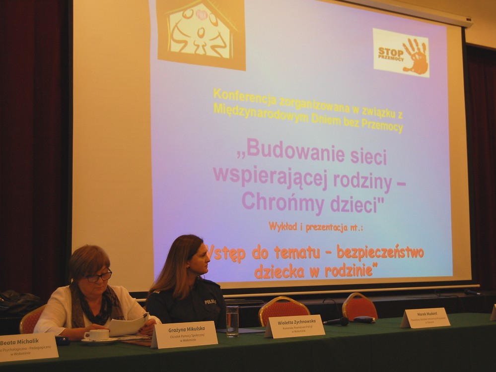 Zespół Interdyscyplinarny ds. Przeciwdziałania Przemocy w Rodzinie w Wołominie, Powiatowy Ośrodek Interwencji Kryzysowej w Zielonce, oraz Ośrodek Pomocy Społecznej w Wołominie zorganizowali 4 października br. II konferencję ?Budowanie sieci wspierającej Rodziny- Chrońmy dzieci?. Uczestnikami Konferencji poświęconej m.in. Międzynarodowemu Dniu bez Przemocy byli przedstawiciele instytucji samorządowych, Prokuratury, Sądu oraz policjanci wołomińskiej Komendy zajmujący się tematem przeciwdziałania przemocy w rodzinie, procedurą Niebieskiej Karty, pomocy dziecku krzywdzonemu, czy też konfliktem i kryzysem małżeńskim. Gościem specjalnym konferencji była sędzia Anna Maria Wesołowska. To kolejna taka konferencja w powiecie wołomińskim, której tematem przewodnim był szeroko zakrojony temat poświęcony pomocy rodzinom dotkniętym przemocą.