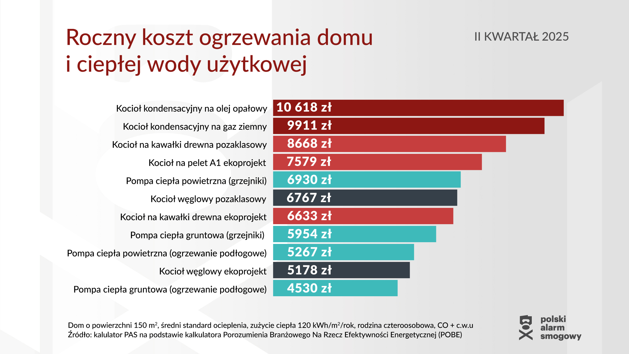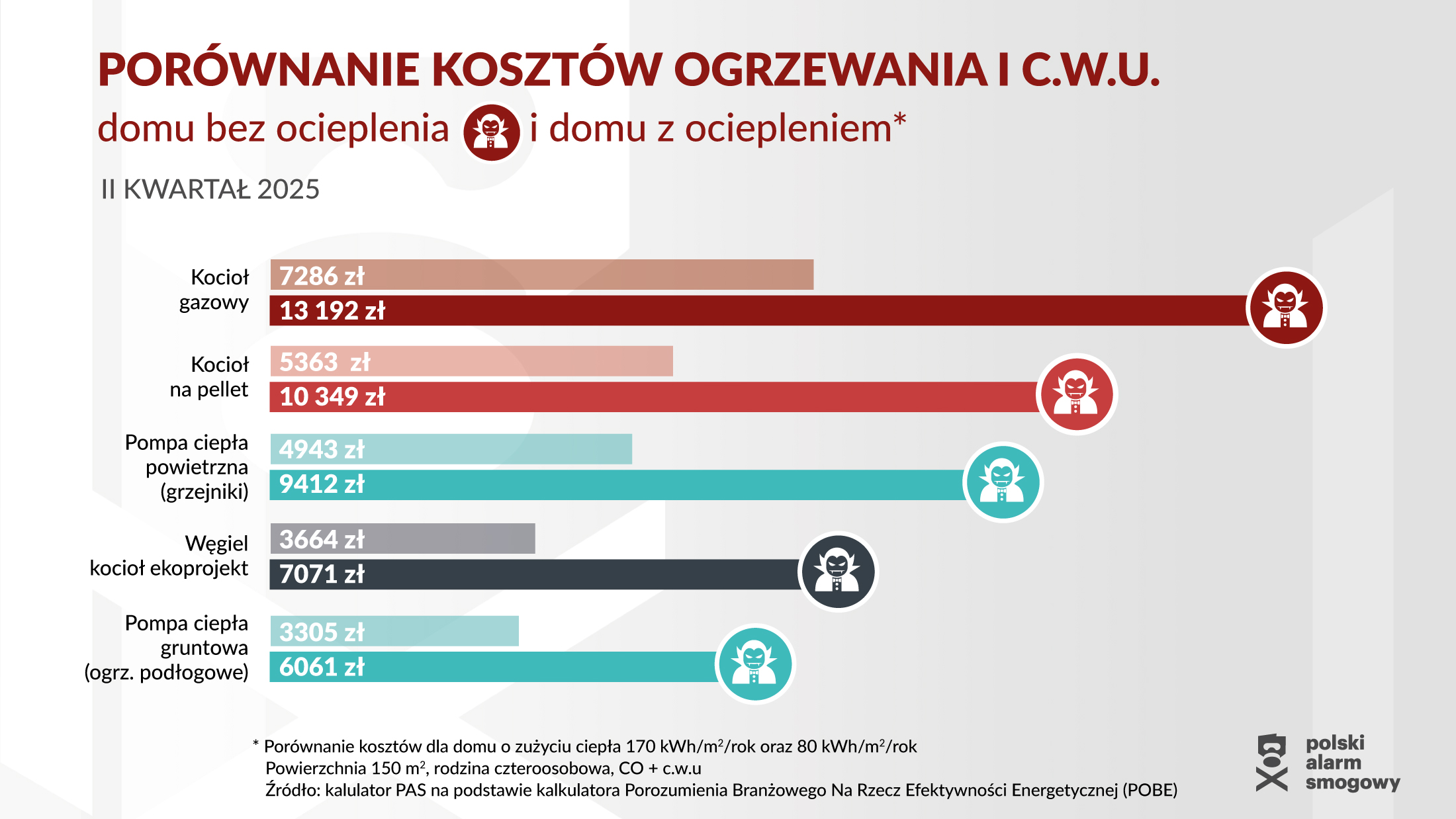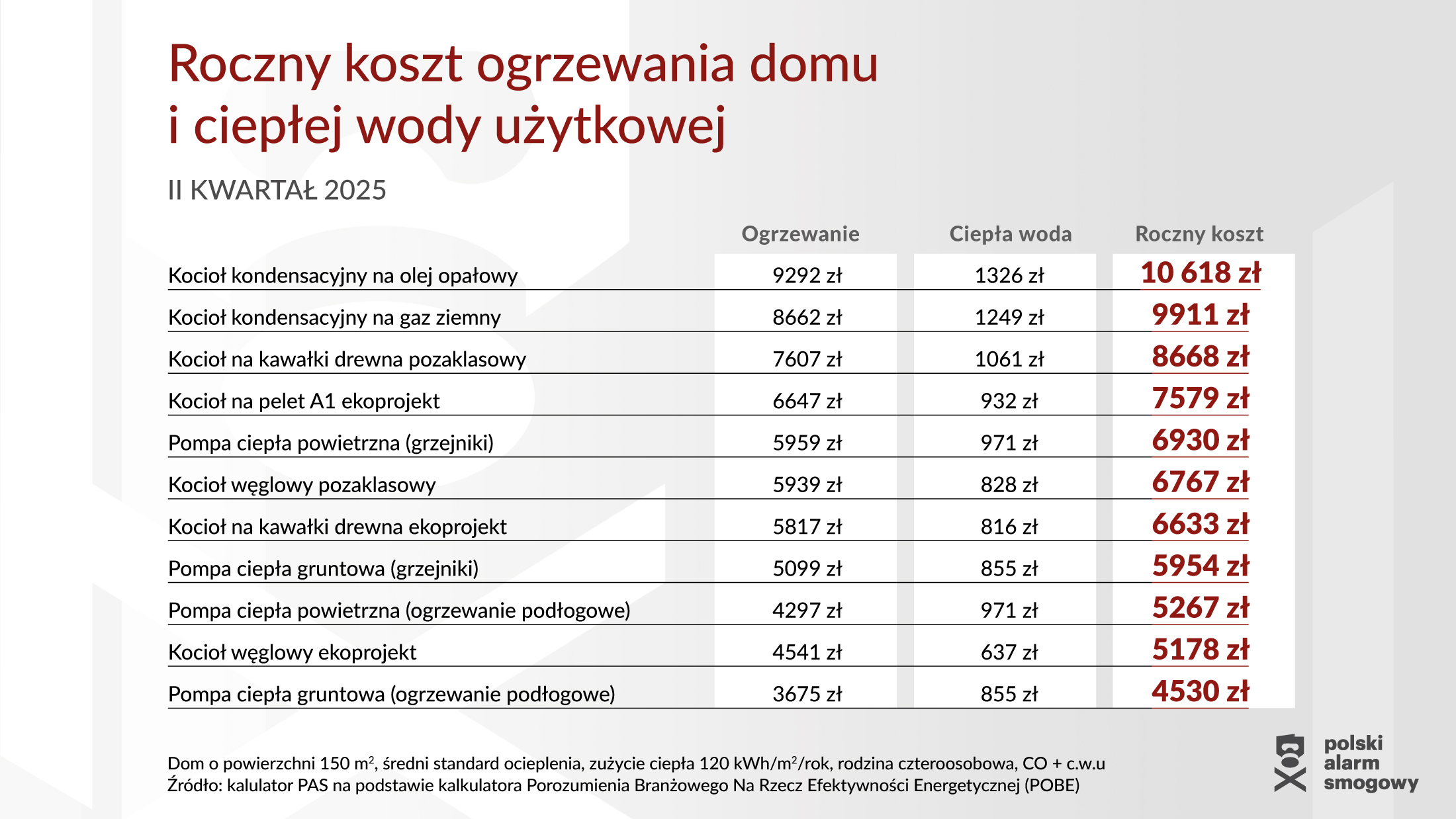 Polski Alarm Smogowy sprawdził jak kształtują się obecnie koszty ogrzewania typowego domu jednorodzinnego. Koszty ogrzewania (budynku i ciepłej wody użytkowej) sprawdzono dla budynku o powierzchni 150 m² ze średnim ociepleniem (zużycie ciepła na poziomie 120 kWh/rok/m²), zamieszkałego przez czteroosobową rodzinę.
