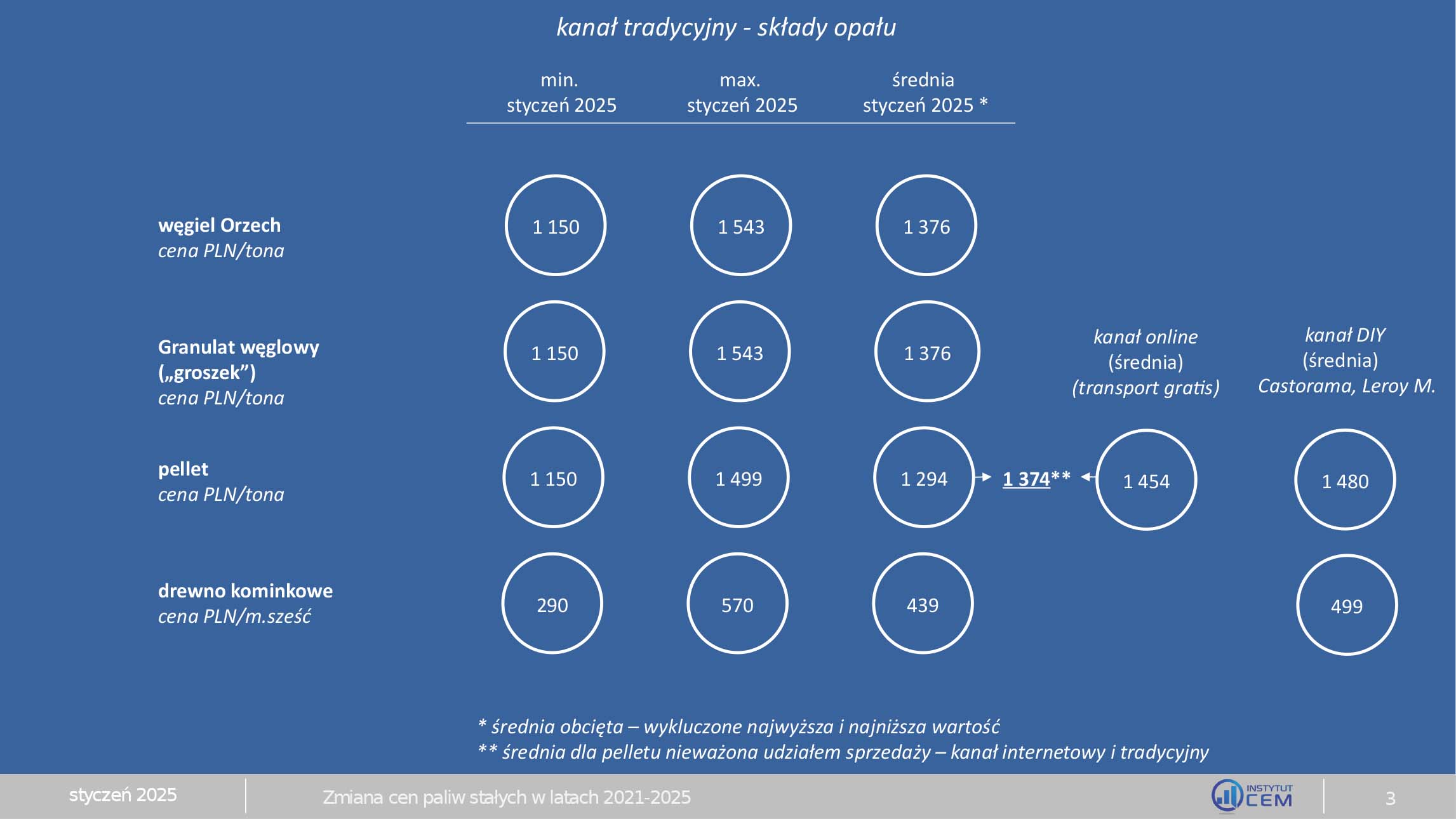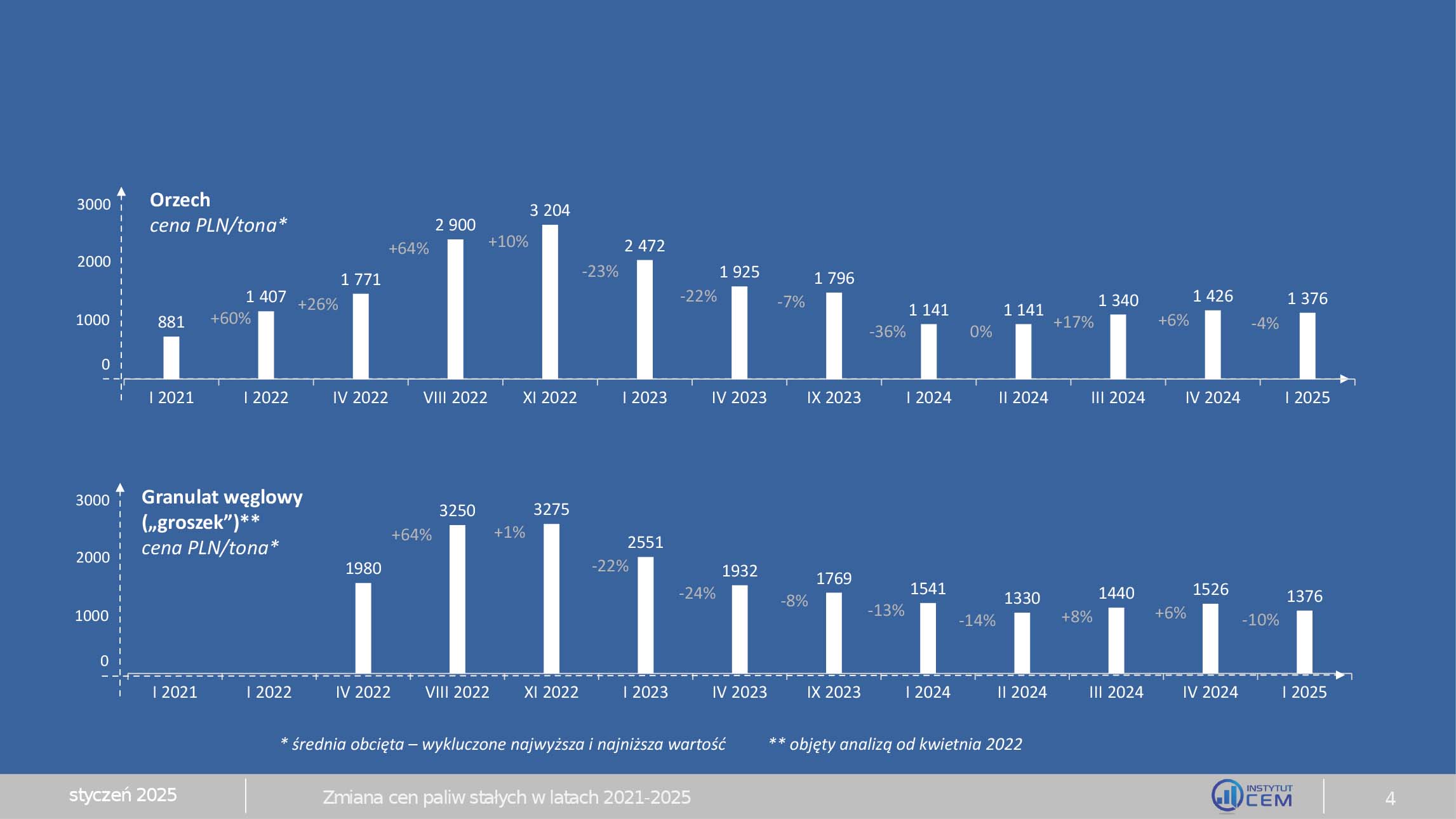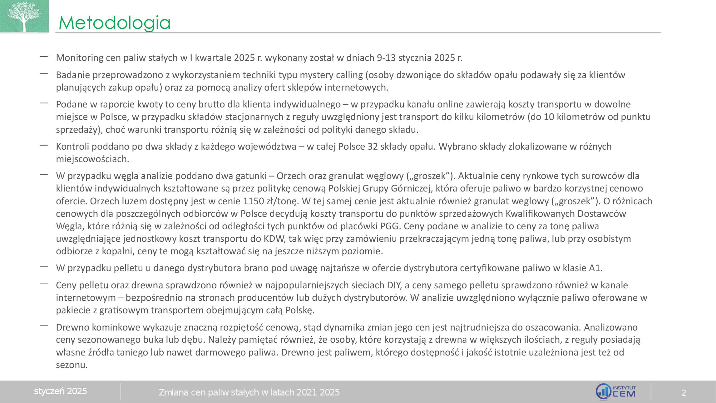 Ceny paliw stałych pochodzą z początku stycznia 2025 r. Ankietę przeprowadzono w 32 składach, we wszystkich województwach. Jak podkreślają autorzy raportu: „Aktualnie ceny rynkowe tych surowców dla klientów indywidualnych kształtowane są przez politykę cenową Polskiej Grupy Górniczej, która oferuje paliwo w bardzo korzystnej cenowo ofercie. Orzech luzem dostępny jest w cenie 1150 zł/tonę. W tej samej cenie jest aktualnie również granulat węglowy typu groszek”.