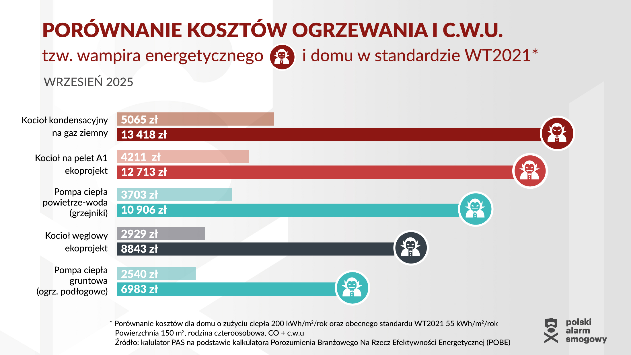 Na podstawie przeprowadzonego we wrześniu 2025 roku monitoringu cen paliw i nośników energii, Polski Alarm Smogowy po raz kolejny przeanalizował roczne koszty ogrzewania domów dla różnych rodzajów źródeł ciepła.