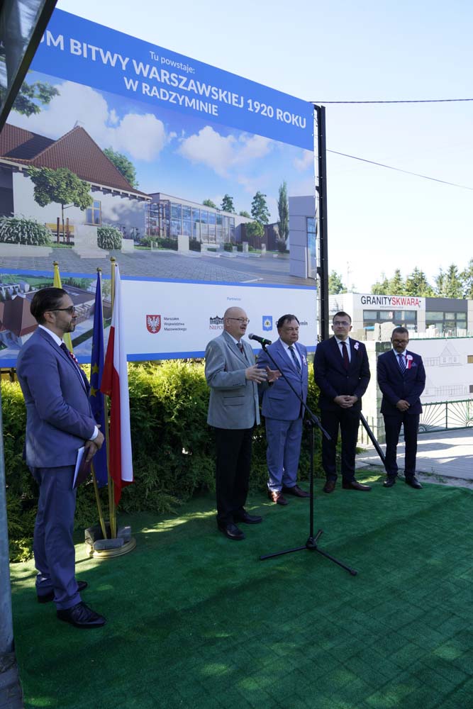 Rok wcześniej Marszałek Województwa Mazowieckiego i Burmistrz Radzymina uroczyście podpisali list intencyjny w sprawie samorządowej inwestycji w Muzeum Bitwy Warszawskiej 1920 w Radzyminie. Przez ten rok gmina pozyskała grunt pod budowę obiektu, powstała koncepcja rewitalizacji i rozbudowy ?Świetlicy Pielgrzyma?, poczyniono uzgodnienia z Mazowieckim Konserwatorem Zabytków, a także rozpoczęło się projektowanie. Przewidywany początek prac budowlanych to wiosna 2021 r.