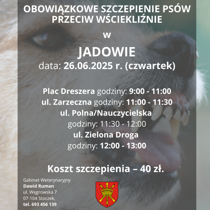 Urząd Miasta i Gminy Jadów opublikował harmonogram szczepień psów na najbliższy tydzień: 24-26.06.2025 r.