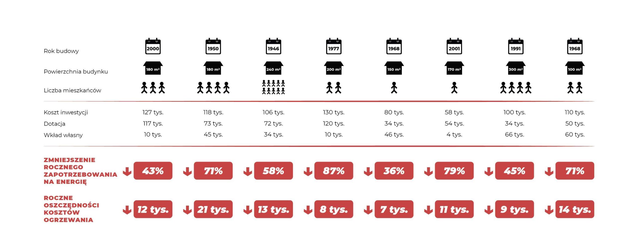 Na przykładzie przeprowadzonych audytów widać jak inwestycja termomodernizacyjna może obniżyć rachunki za ogrzewanie budynku i ciepłej wody użytkowej oraz na jaki poziom dofinansowania mogą liczyć beneficjenci wymieniający źródło ogrzewania i ocieplający dom, a także jak szybko taka inwestycja się zwróci przy skorzystaniu z dotacji.