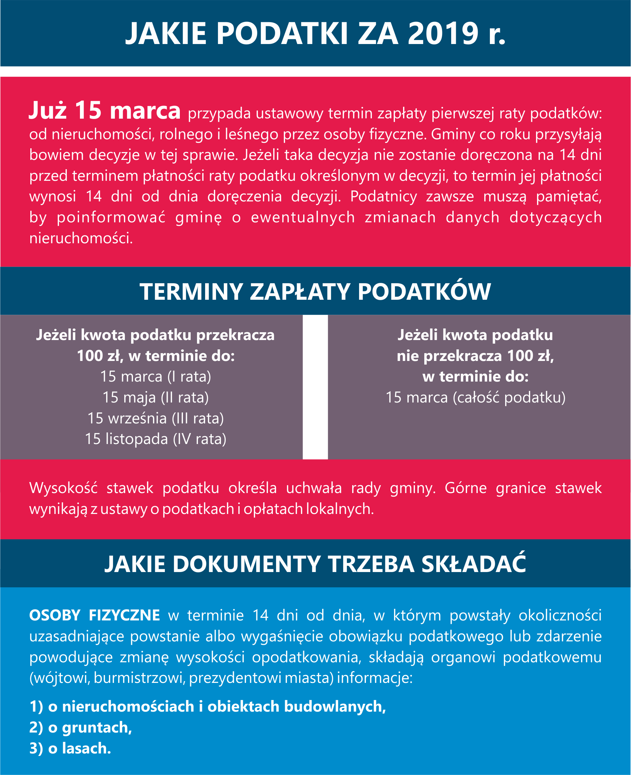Już 15 marca przypada ustawowy termin zapłaty pierwszej raty podatków: od nieruchomości, rolnego i leśnego przez osoby fizyczne. Gminy co roku przysyłają bowiem decyzje w tej sprawie. Jeżeli taka decyzja nie zostanie doręczona na 14 dni przed terminem płatności raty podatku określonym w decyzji, to termin jej płatności wynosi 14 dni od dnia doręczenia decyzji. Podatnicy zawsze muszą pamiętać, by poinformować gminę o ewentualnych zmianach danych dotyczących nieruchomości.