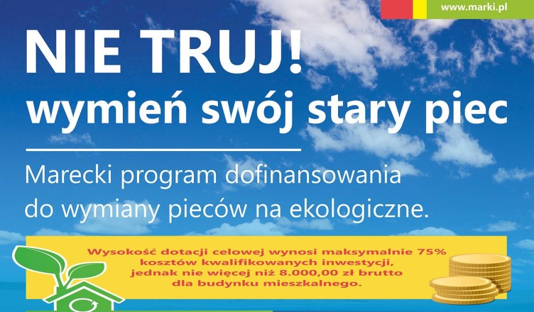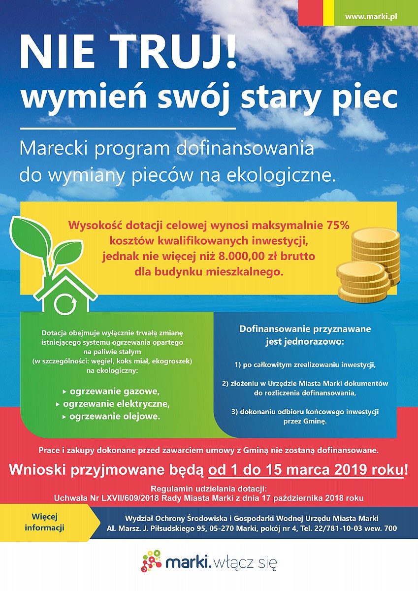 Poniżej znajduje się Uchwała Nr LXVII/609/2018 Rady Miasta Marki z dnia 17 października 2018 roku w sprawie przyjęcia regulaminu udzielania dotacji celowej z budżetu Gminy Miasto Marki na dofinansowanie zadania polegającego na ograniczeniu emisji zanieczyszczeń poprzez trwałą zmianę istniejącego systemu ogrzewania opartego na paliwie stałym w budynkach mieszkalnych zlokalizowanych na terenie Gminy Miasto Marki wraz z: