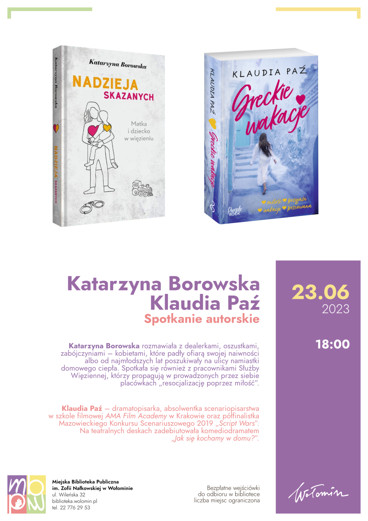 Już 23 czerwca matka i córka zagoszczą na spotkaniu autorskim, promującym najnowsze wydawnictwa: Katarzyna Borowska „Nadzieja skazanych” i Klaudia Paź „Greckie wakacje”.